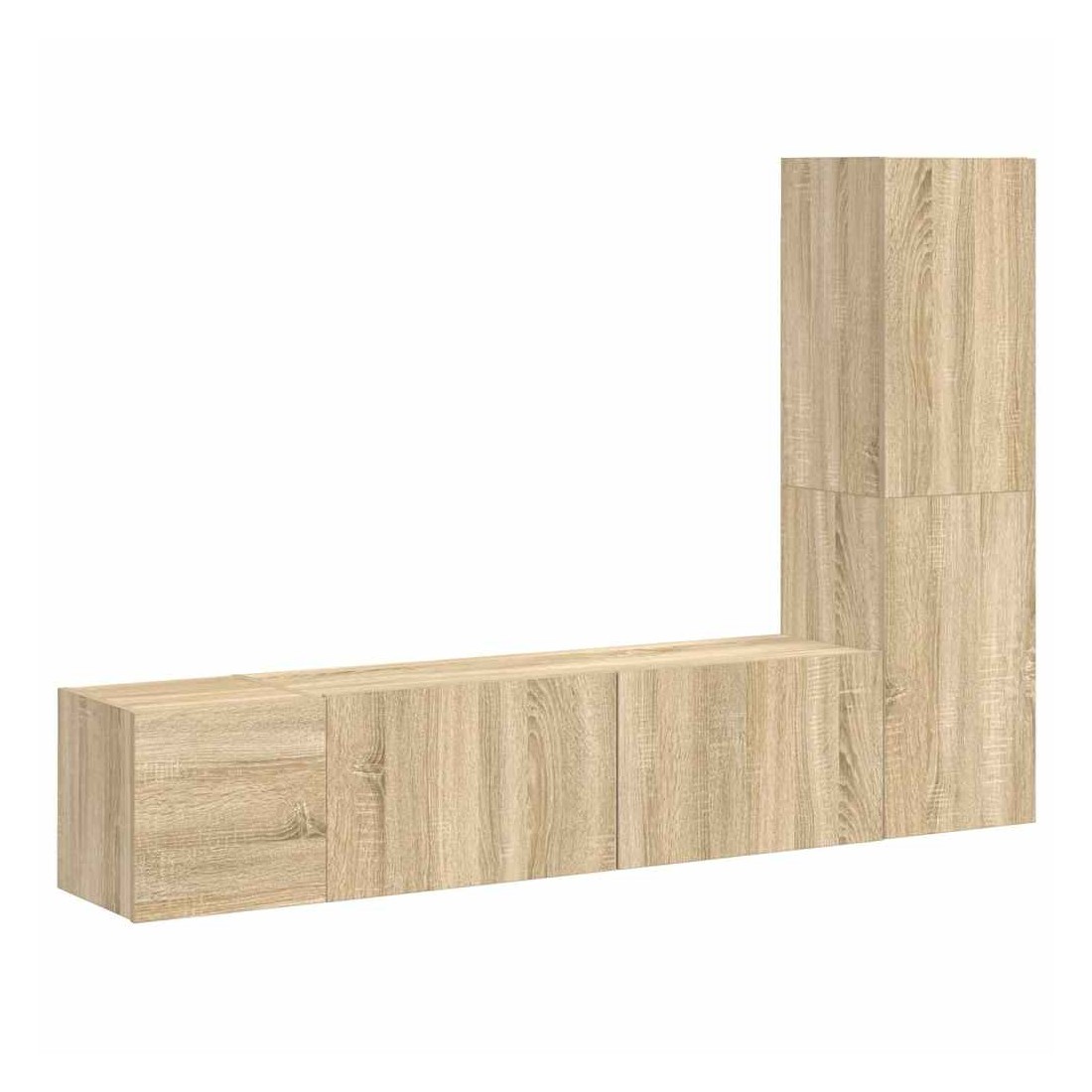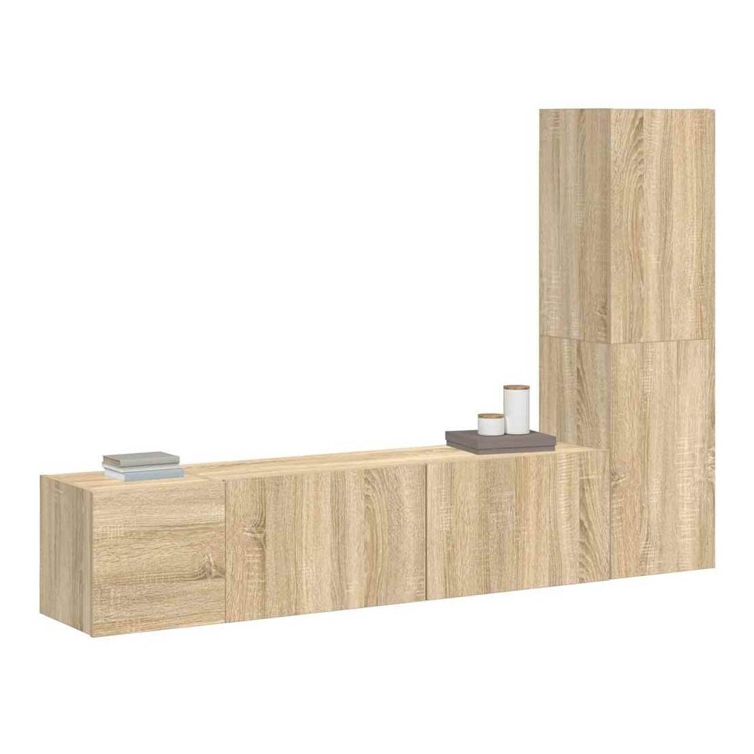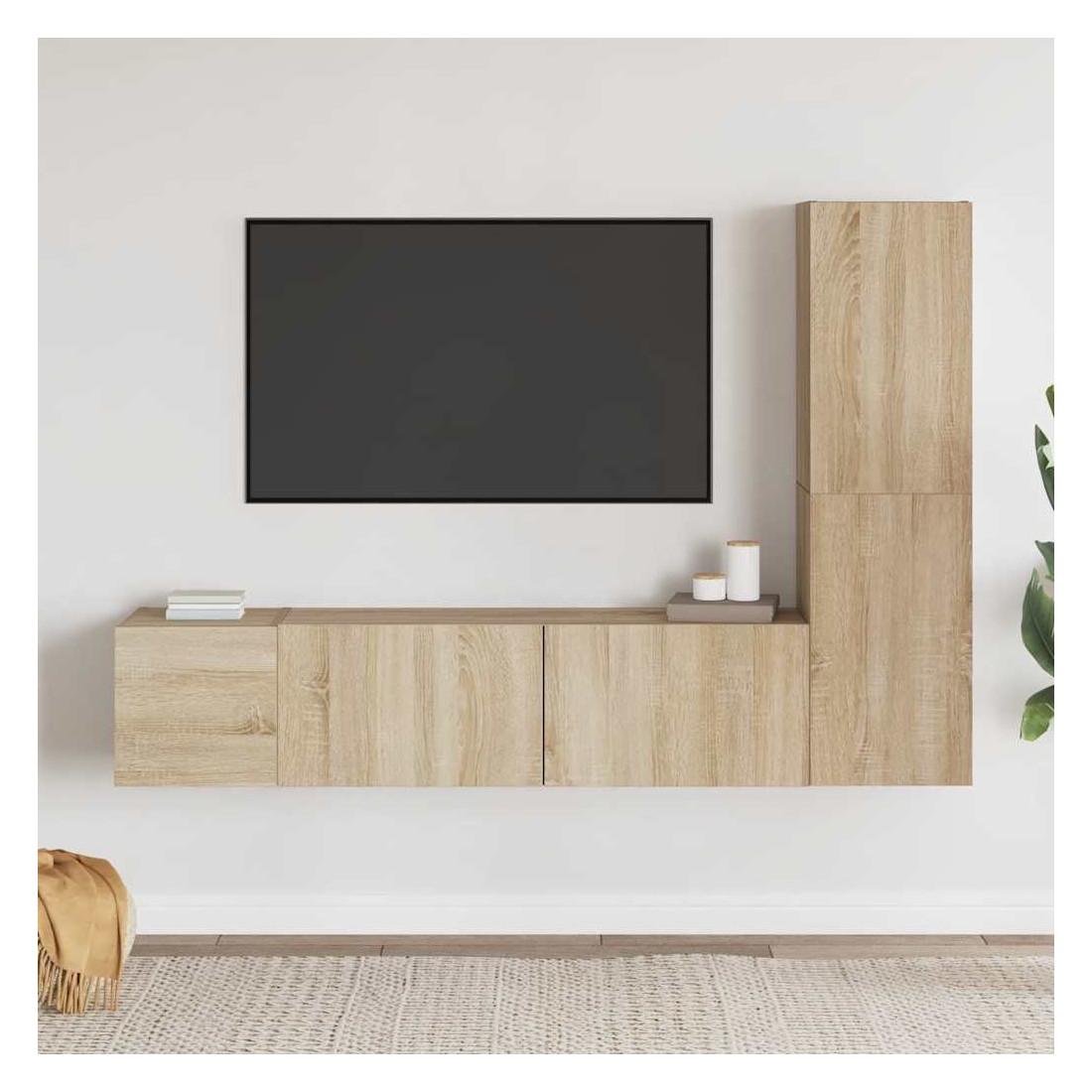 Cet ensemble de meuble TV robuste est destiné à être le point de mire de votre pièce avec un design à la fois tendance et pratique. Le meuble TV est fixé au mur, ce qui en fait un supplément intemporel à votre maison. Il offre de nombreux compartiments de rangement, ce qui en fait un endroit idéal pour stocker tous vos livres, magazines, DVD ou autres objets. Le meuble stéréo est facile à entretenir et à nettoyer avec un chiffon humide.