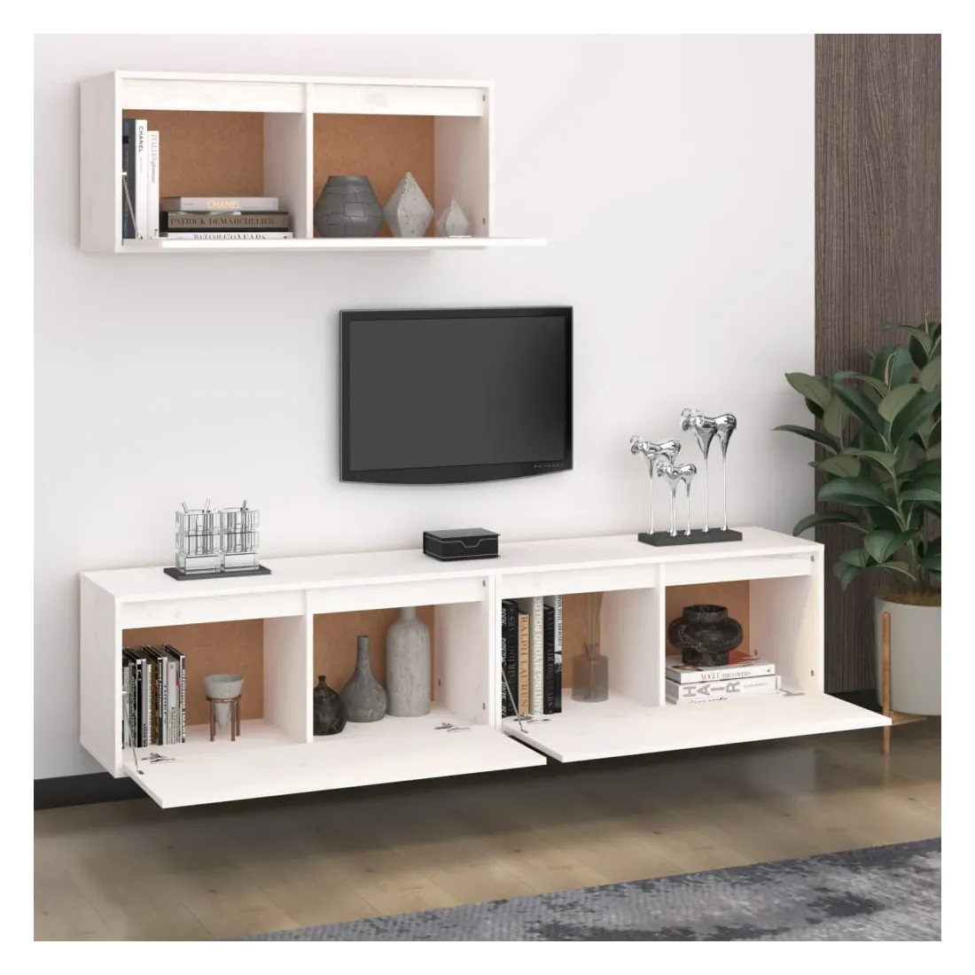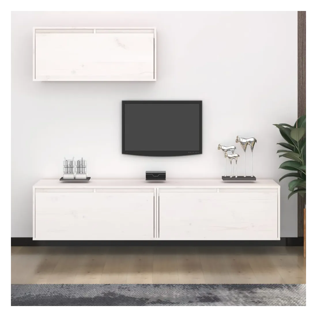 Ces meubles TV classiques sont conçus pour être le point de mire de votre pièce avec un design à la fois tendance et pratique. Ces armoires suspendues sont fabriquées en bois de pin massif, ce qui garantit leur solidité, durabilité et longévité. Les unités murales sont l'endroit idéal pour ranger des objets tels que des livres, des objets de collection, des bibelots, etc. Elles transforment un mur vide en une caractéristique de conception. De plus, les armoires flottantes sont faciles à nettoyer avec un chiffon humide. Veuillez noter : Les vis et les chevilles pour l'intérieur du mur ne sont pas incluses. Recherchez et utilisez des vis et des chevilles adaptées à vos murs. Si vous n'êtes pas sûr, demandez conseil à un professionnel. Lisez et suivez attentivement chaque étape de l'instruction.