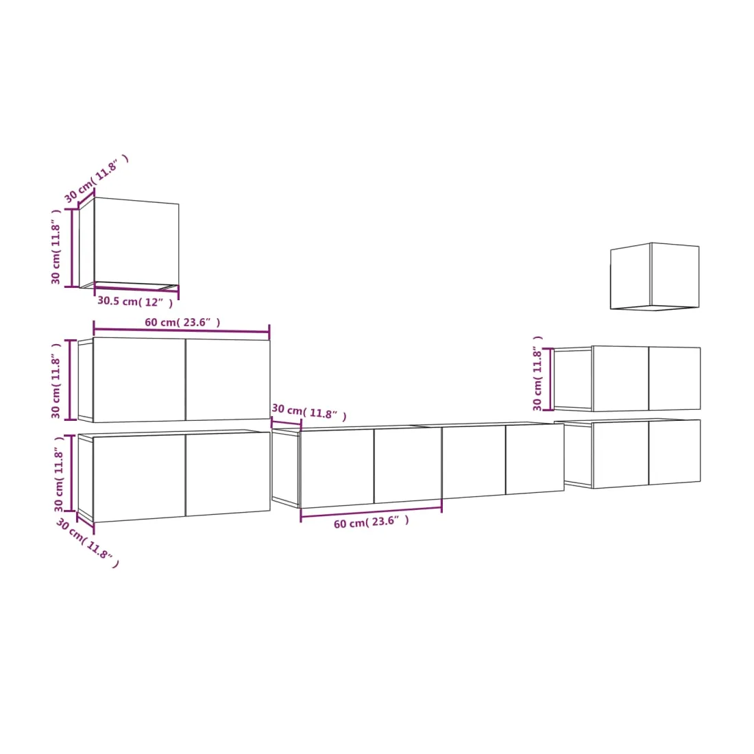 • Meuble TV (grand) : 60 x 30 x 30 cm (l x P x H)