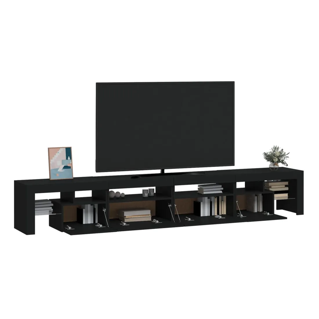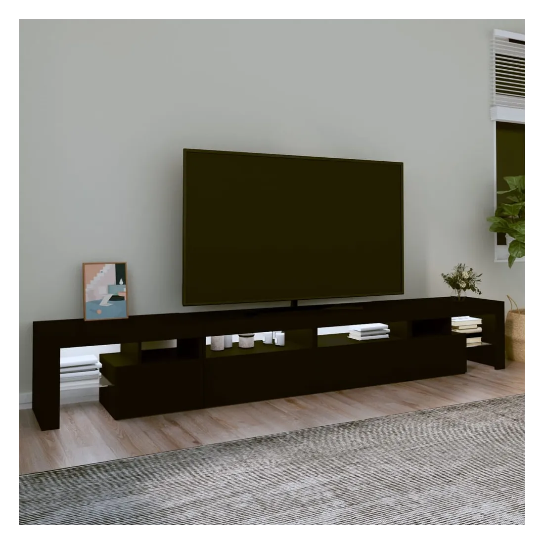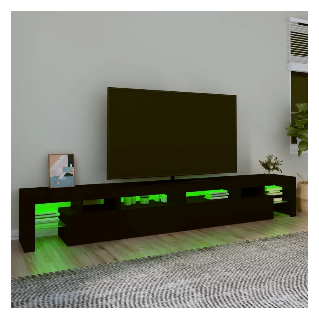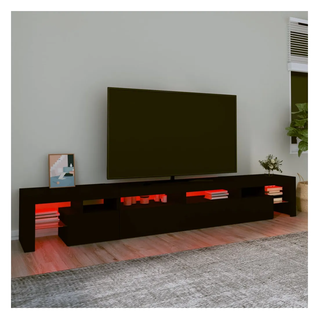 Avec un design à la fois tendance et pratique, ce meuble TV avec éclairage LED deviendra certainement un point central de votre pièce. Matériau pratique : le bois d'ingénierie est d'une qualité exceptionnelle avec une surface lisse et présente également résistance, stabilité et résistance à l'humidité. Lumières LED colorées : le meuble TV est doté de lumières LED RVB, qui ont différents menus pour changer la couleur des lumières et laisser la couleur s'ajuster automatiquement. Les lumières LED soulignent l'aspect moderne et contribuent à la sensation de tendance.Grand espace de rangement : le meuble TV offre un grand espace de rangement pour garder vos magazines, livres, télécommandes et autres petits objets bien organisés et à portée de main.Fonction d'affichage : le dessus robuste du meuble média est idéal pour exposer des objets décoratifs, des cadres photo et des plantes en pot. Remarque :Ce produit est doté d'un connecteur USB, mais la source d'alimentation certifiée de USB 5V n'est pas incluse.Chaque produit est livré avec un manuel de montage dans la boîte pour un montage facile.