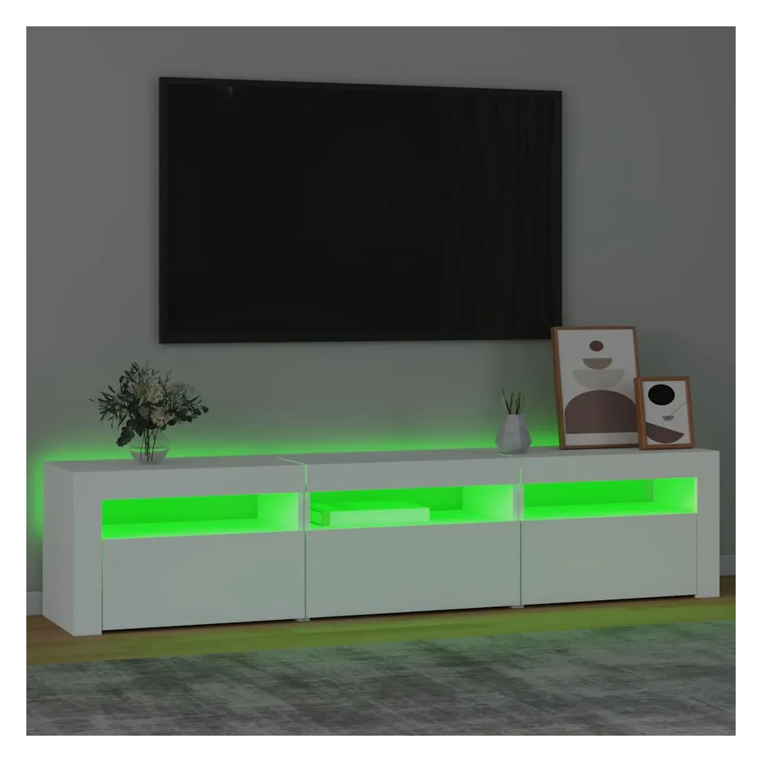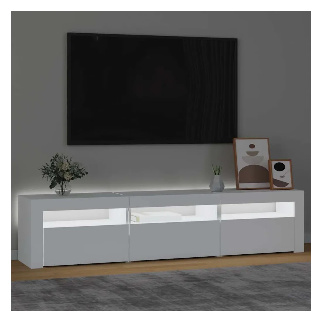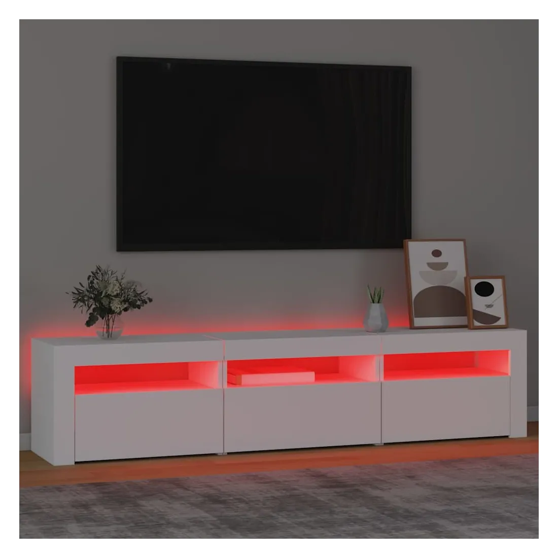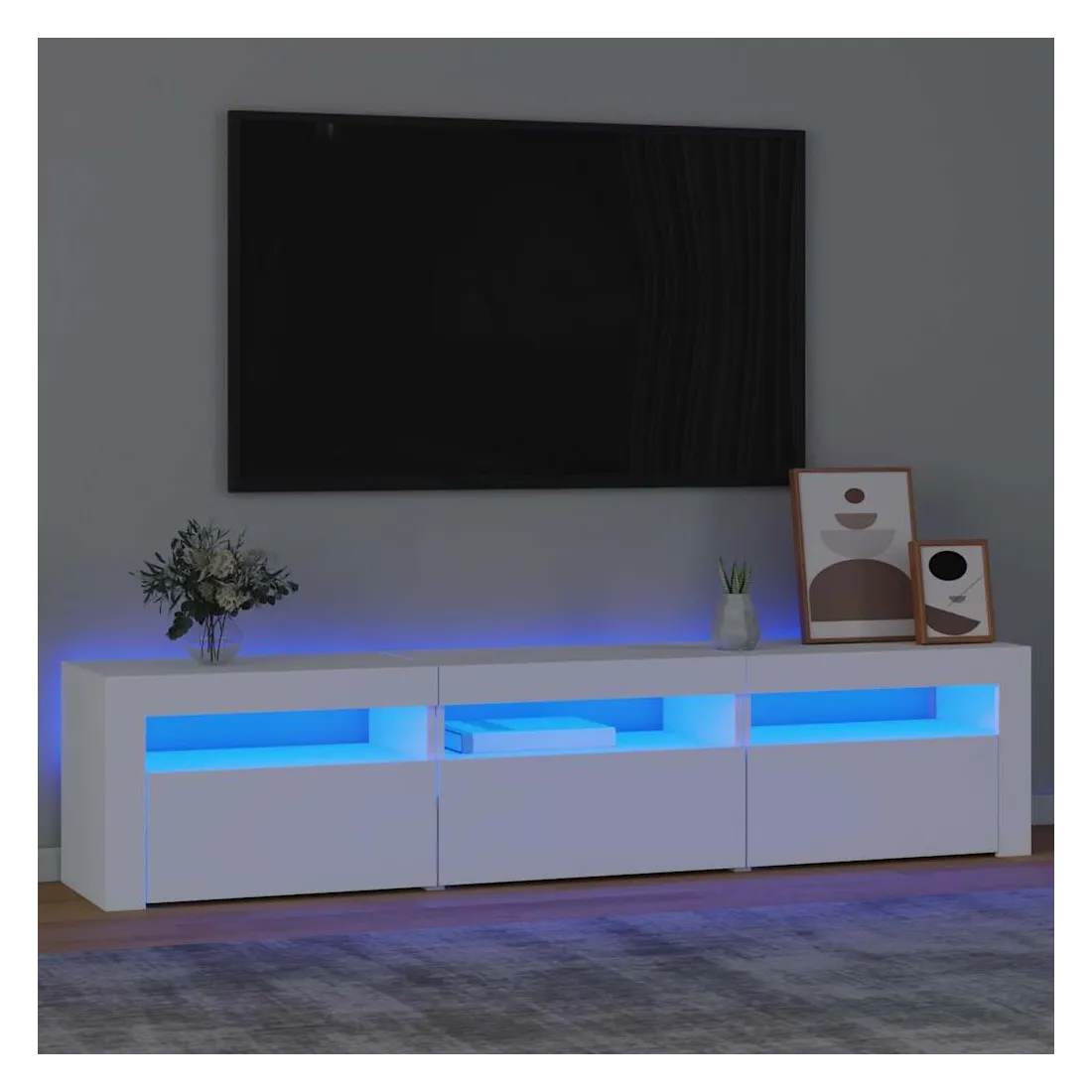 Avec un design à la fois tendance et pratique, ce meuble TV avec éclairage LED deviendra certainement un point central de votre pièce. Matériau pratique : le bois d'ingénierie est d'une qualité exceptionnelle avec une surface lisse et présente également résistance, stabilité et résistance à l'humidité. Lumières LED colorées : le meuble TV est doté de lumières LED RVB, qui ont différents menus pour changer la couleur des lumières et laisser la couleur s'ajuster automatiquement. Les lumières LED soulignent l'aspect moderne et contribuent à la sensation de tendance.Grand espace de rangement : le meuble TV offre un grand espace de rangement pour garder vos magazines, livres, télécommandes et autres petits objets bien organisés et à portée de main.Fonction d'affichage : le dessus robuste du meuble média est idéal pour exposer des objets décoratifs, des cadres photo et des plantes en pot. Remarque :Ce produit est doté d'un connecteur USB, mais la source d'alimentation certifiée de USB 5V n'est pas incluse.Chaque produit est livré avec un manuel de montage dans la boîte pour un montage facile.