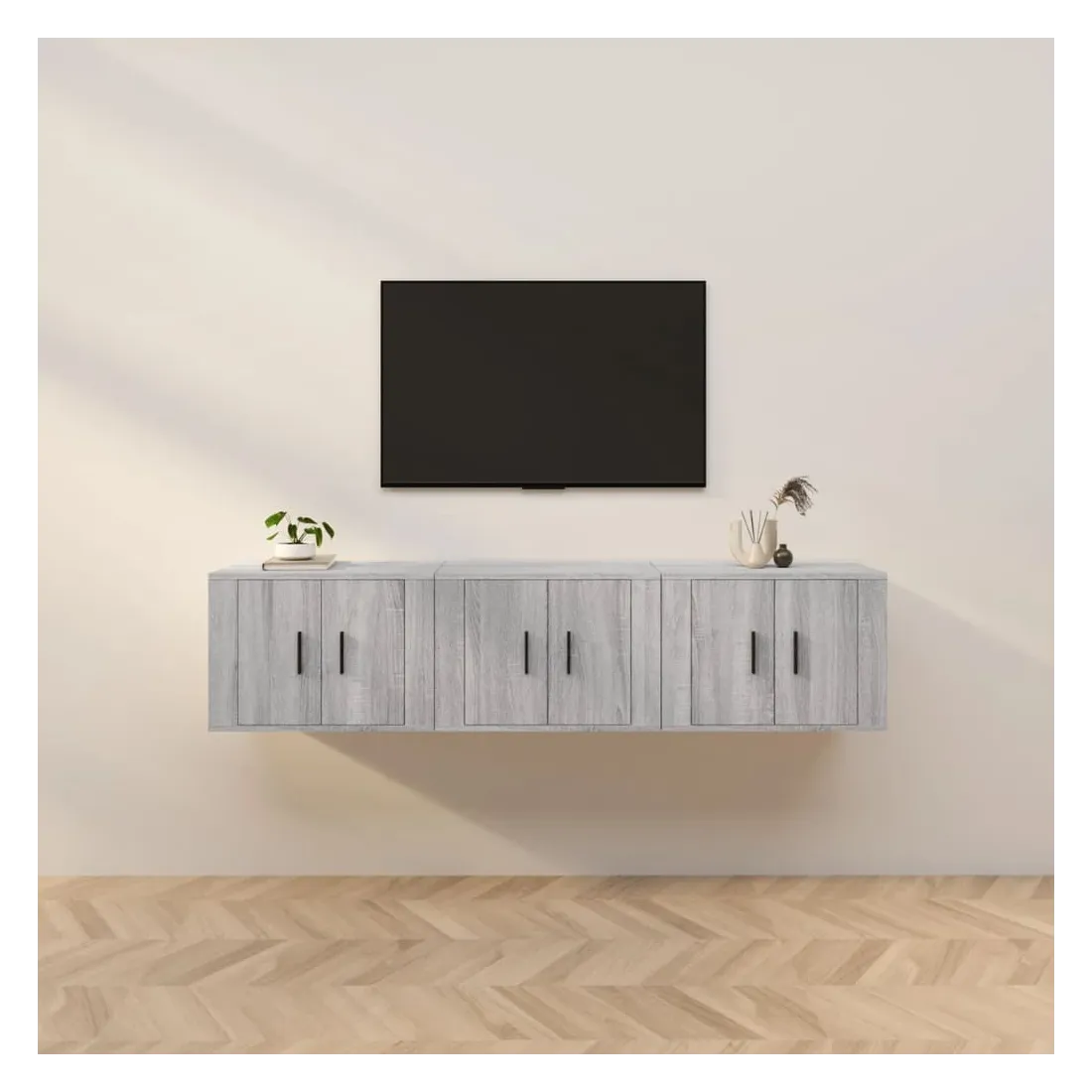 Ces meubles TV muraux présentent un design élégant et classique, ce qui en fait une extension décorative et pratique de votre décor. Matériau durable : le bois d'ingénierie est d'une qualité exceptionnelle avec une surface lisse et présente également résistance, stabilité et résistance à l'humidité.Grand espace de rangement : le meuble TV a un compartiment, offrant un grand espace de rangement pour vous permettre d'organiser des articles comme un lecteur multimédia, des magazines et d'autres choses.Fonction de montage au mur : le meuble TV ne prend pas de place au sol. Vous pouvez l'accrocher au mur facilement.Dessus robuste : le dessus de l'armoire multimédia est un endroit idéal pour ranger des objets tels que des livres et des ornements.Portes pratique : gardez vos essentiels à l'abri de la poussière en les cachant derrière la porte de l’unité multimédia. Bon à savoir :Pour faciliter au maximum le montage, chaque produit est livré avec des instructions.Les vis et les chevilles pour l'intérieur du mur ne sont pas incluses. Nous vous conseillons de trouver et d'utiliser des vis et des chevilles adaptées spécifiquement à vos murs. Si vous n'êtes pas sûr, vous pouvez consulter un professionnel. Veuillez lire et suivre chaque étape des instructions.