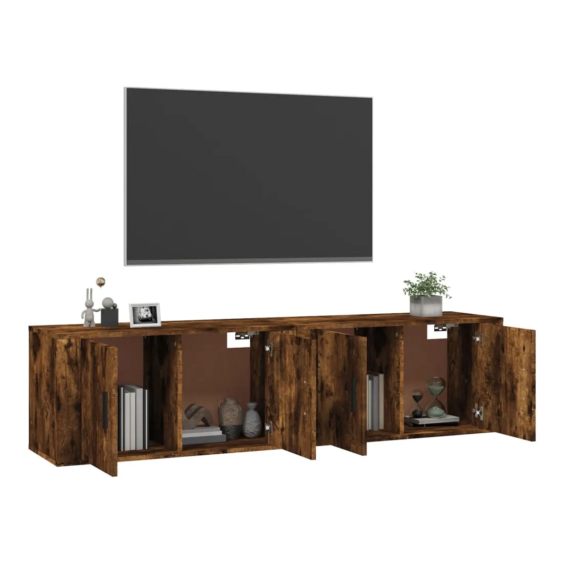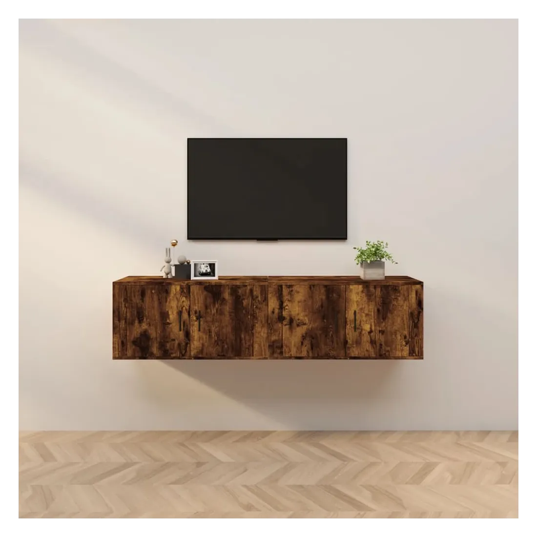 Ces meubles TV muraux présentent un design élégant et classique, ce qui en fait une extension décorative et pratique de votre décor. Matériau durable : le bois d'ingénierie est d'une qualité exceptionnelle avec une surface lisse et présente également résistance, stabilité et résistance à l'humidité.Grand espace de rangement : le meuble TV a un compartiment, offrant un grand espace de rangement pour vous permettre d'organiser des articles comme un lecteur multimédia, des magazines et d'autres choses.Fonction de montage au mur : le meuble TV ne prend pas de place au sol. Vous pouvez l'accrocher au mur facilement.Dessus robuste : le dessus de l'armoire multimédia est un endroit idéal pour ranger des objets tels que des livres et des ornements.Portes pratique : gardez vos essentiels à l'abri de la poussière en les cachant derrière la porte de l’unité multimédia. Bon à savoir :Pour faciliter au maximum le montage, chaque produit est livré avec des instructions.Les vis et les chevilles pour l'intérieur du mur ne sont pas incluses. Nous vous conseillons de trouver et d'utiliser des vis et des chevilles adaptées spécifiquement à vos murs. Si vous n'êtes pas sûr, vous pouvez consulter un professionnel. Veuillez lire et suivre chaque étape des instructions.