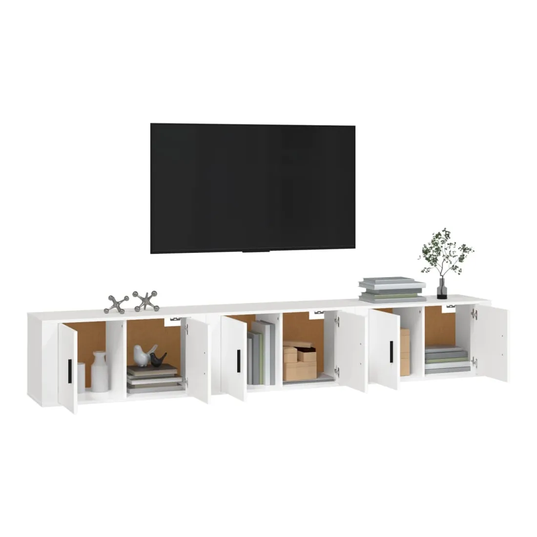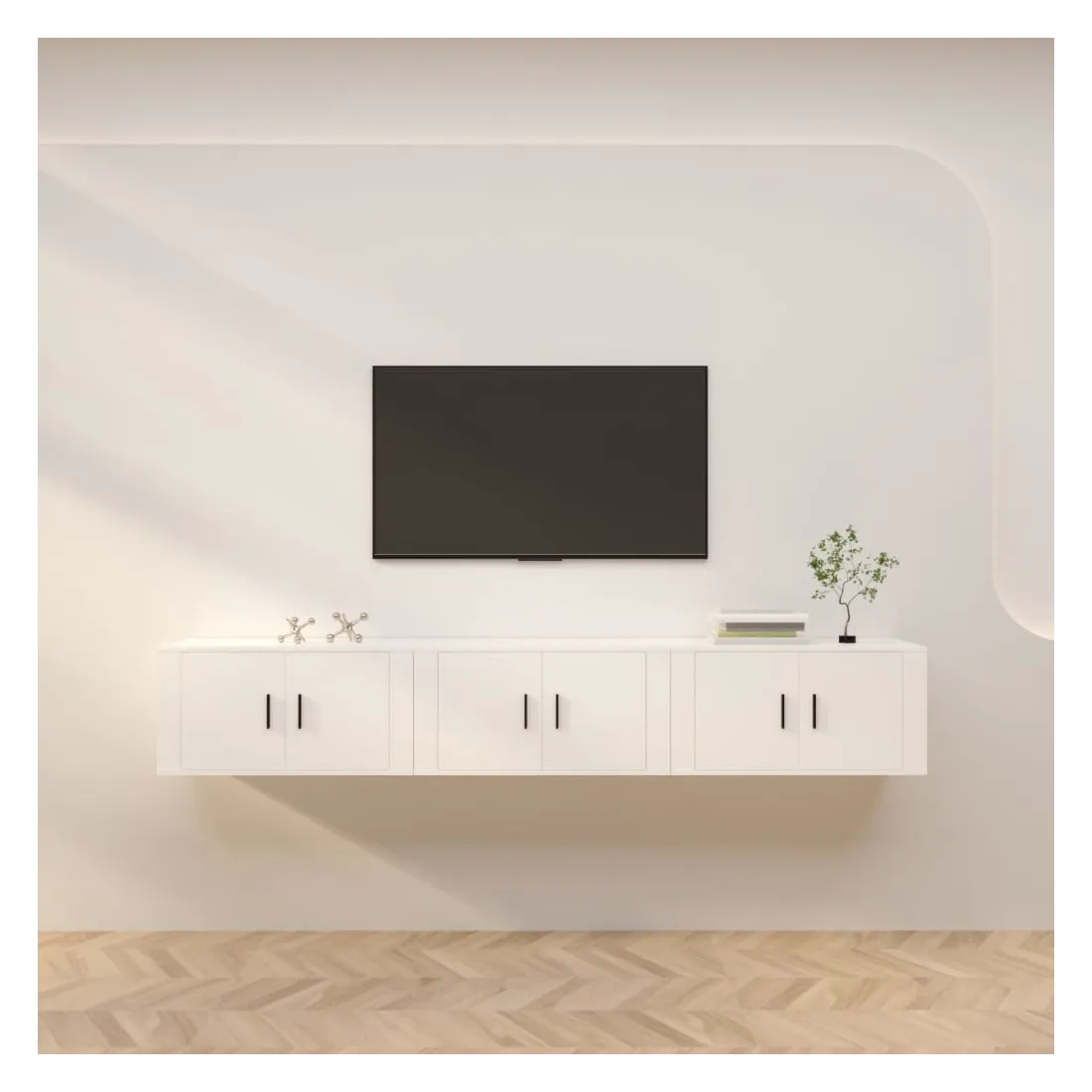 Ces meubles TV muraux présentent un design élégant et classique, ce qui en fait une extension décorative et pratique de votre décor. Matériau durable : le bois d'ingénierie est d'une qualité exceptionnelle avec une surface lisse et présente également résistance, stabilité et résistance à l'humidité.Grand espace de rangement : le meuble TV a un compartiment, offrant un grand espace de rangement pour vous permettre d'organiser des articles comme un lecteur multimédia, des magazines et d'autres choses.Fonction de montage au mur : le meuble TV ne prend pas de place au sol. Vous pouvez l'accrocher au mur facilement.Dessus robuste : le dessus de l'armoire multimédia est un endroit idéal pour ranger des objets tels que des livres et des ornements.Portes pratique : gardez vos essentiels à l'abri de la poussière en les cachant derrière la porte de l’unité multimédia. Bon à savoir :Pour faciliter au maximum le montage, chaque produit est livré avec des instructions.Les vis et les chevilles pour l'intérieur du mur ne sont pas incluses. Nous vous conseillons de trouver et d'utiliser des vis et des chevilles adaptées spécifiquement à vos murs. Si vous n'êtes pas sûr, vous pouvez consulter un professionnel. Veuillez lire et suivre chaque étape des instructions.