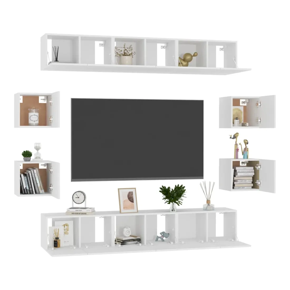 Cet ensemble de meuble TV robuste est destiné à être le point de mire de votre pièce avec un design à la fois tendance et pratique. Le meuble TV est fixé au mur, ce qui en fait un supplément intemporel à votre maison. Il offre de nombreux compartiments de rangement, ce qui en fait un endroit idéal pour stocker tous vos livres, magazines, DVD ou autres objets. Le meuble stéréo est facile à entretenir et à nettoyer avec un chiffon humide.