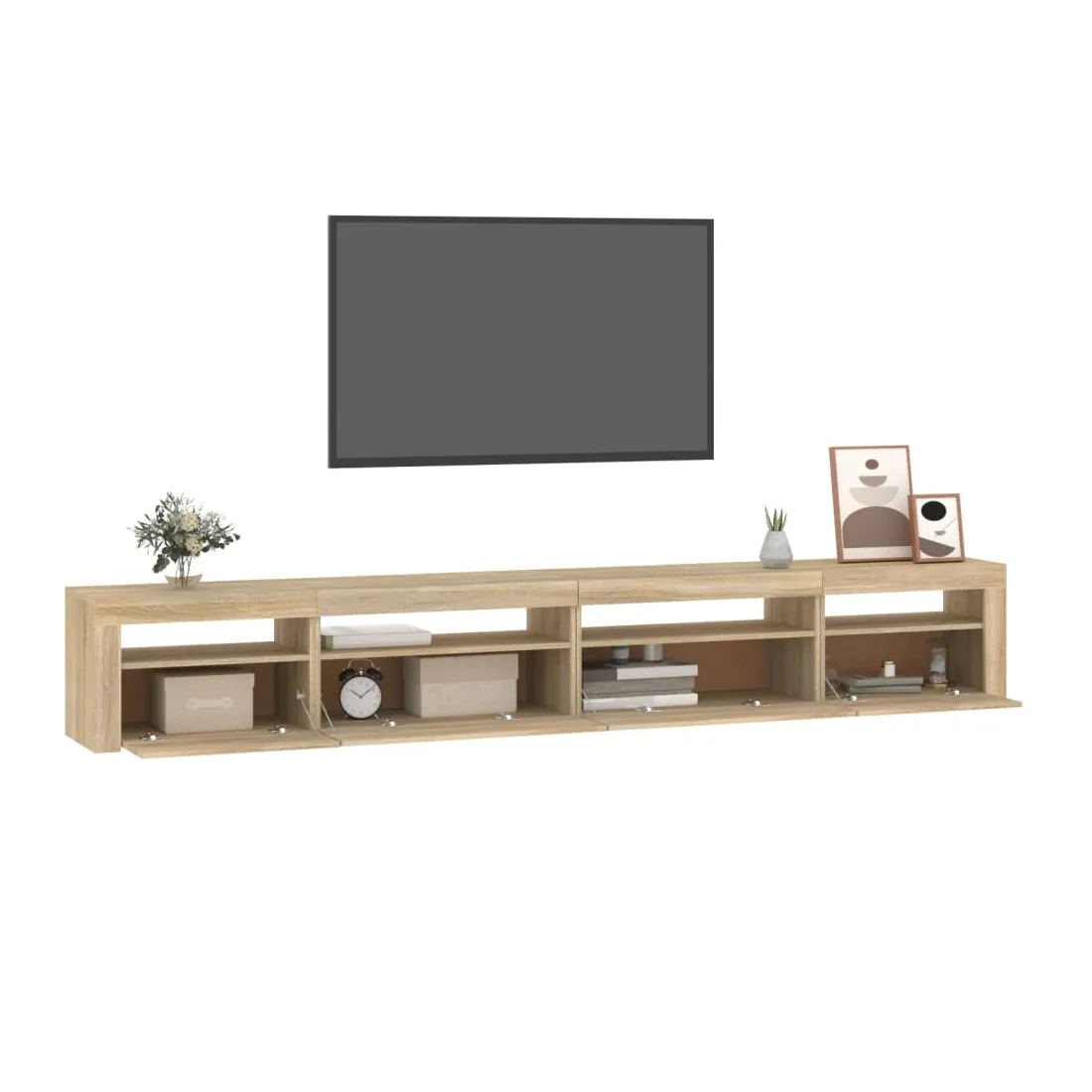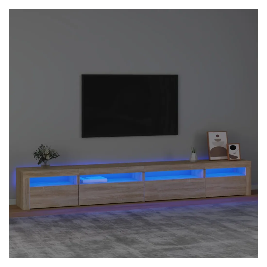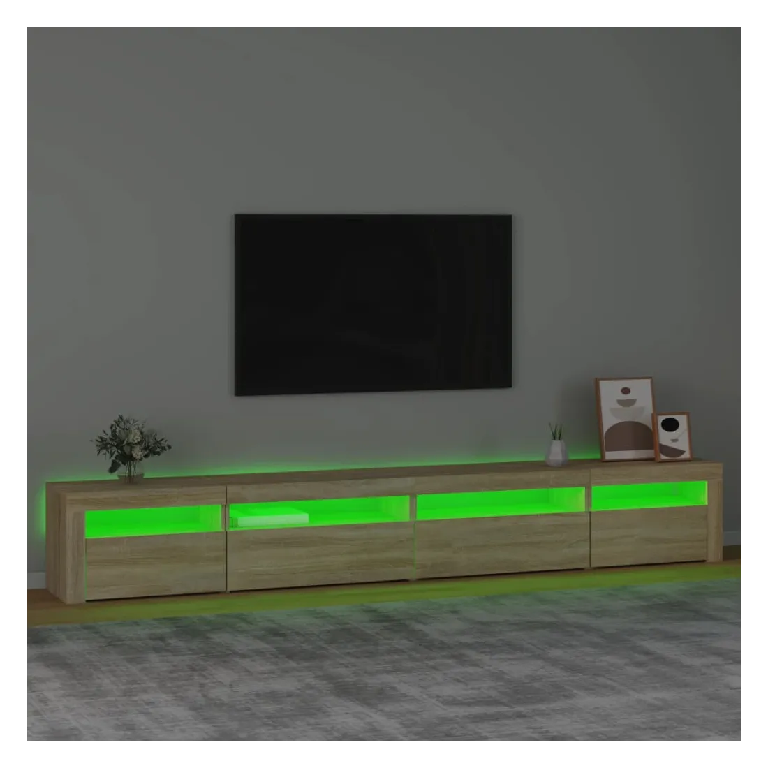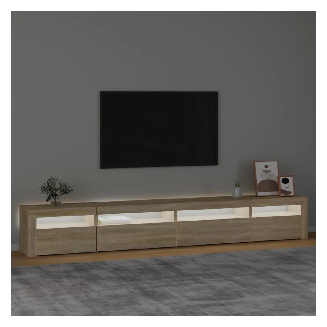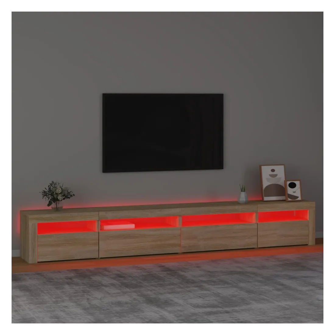 Avec un design à la fois tendance et pratique, ce meuble TV avec éclairage LED deviendra certainement un point central de votre pièce. Matériau pratique : le bois d'ingénierie est d'une qualité exceptionnelle avec une surface lisse et présente également résistance, stabilité et résistance à l'humidité. Lumières LED colorées : le meuble TV est doté de lumières LED RVB, qui ont différents menus pour changer la couleur des lumières et laisser la couleur s'ajuster automatiquement. Les lumières LED soulignent l'aspect moderne et contribuent à la sensation de tendance.Grand espace de rangement : le meuble TV offre un grand espace de rangement pour garder vos magazines, livres, télécommandes et autres petits objets bien organisés et à portée de main.Fonction d'affichage : le dessus robuste du meuble média est idéal pour exposer des objets décoratifs, des cadres photo et des plantes en pot. Remarque :Ce produit est doté d'un connecteur USB, mais la source d'alimentation certifiée de USB 5V n'est pas incluse.Chaque produit est livré avec un manuel de montage dans la boîte pour un montage facile.