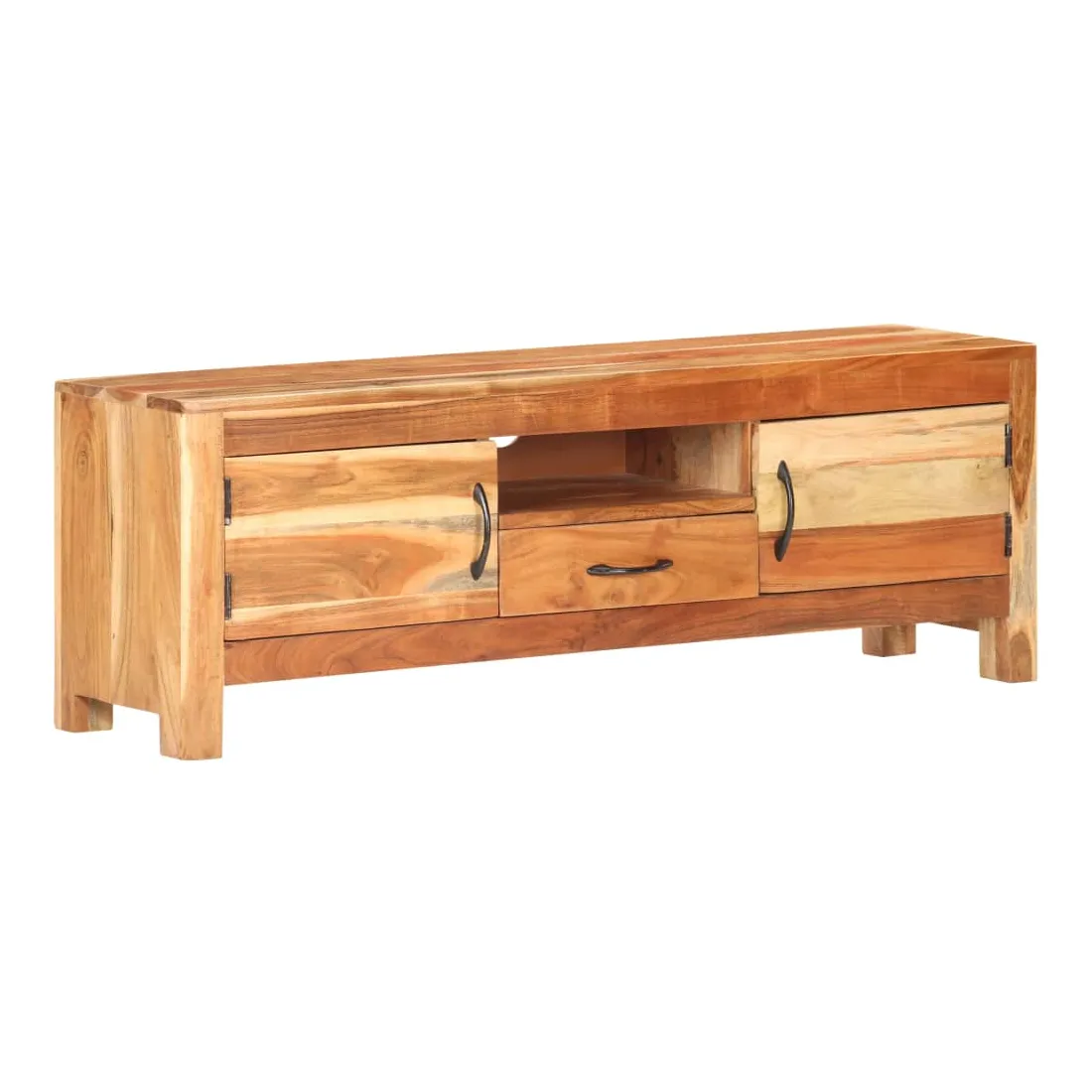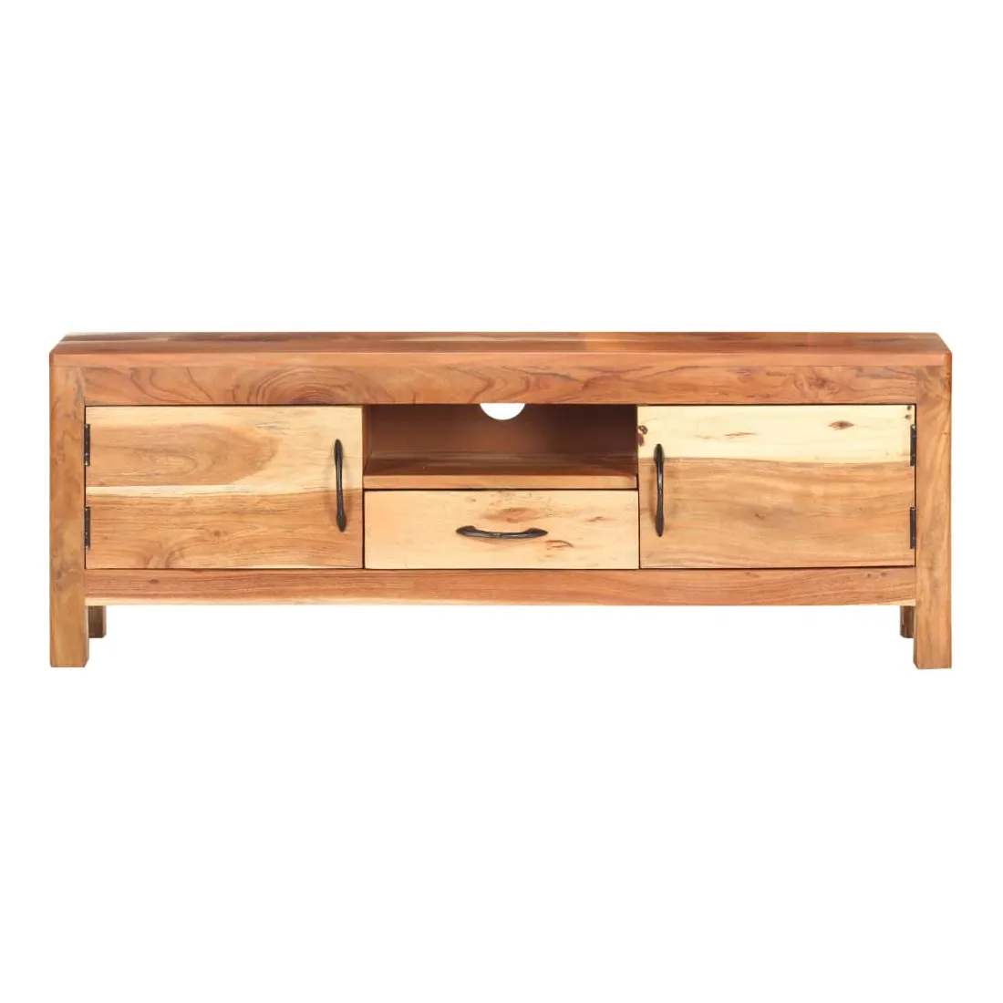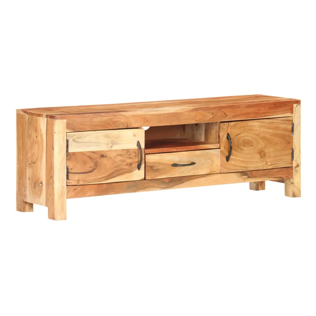 Ce meuble TV en bois présente un style classique et en fait un choix parfait pour votre espace de vie intérieur. Le meuble stéréo est fait de bois d'acacia massif avec une finition naturelle, ce qui le rend stable et durable. Le savoir-faire et les belles veines du bois rendent chaque meuble unique et légèrement différent l'un de l'autre. L’unité multimédia est également dotée de deux portes, d'un tiroir et d'une étagère offrant un vaste espace de rangement. Le dessus robuste peut être utilisé pour afficher des objets décoratifs tels que des cadres photo, des plantes en pot, des vases, etc. Remarque importante : les couleurs et les grains varient d'une pièce à l'autre, rendant chaque pièce unique. La livraison est aléatoire, ce qui garantit l'exclusivité et l'individualité de votre produit.