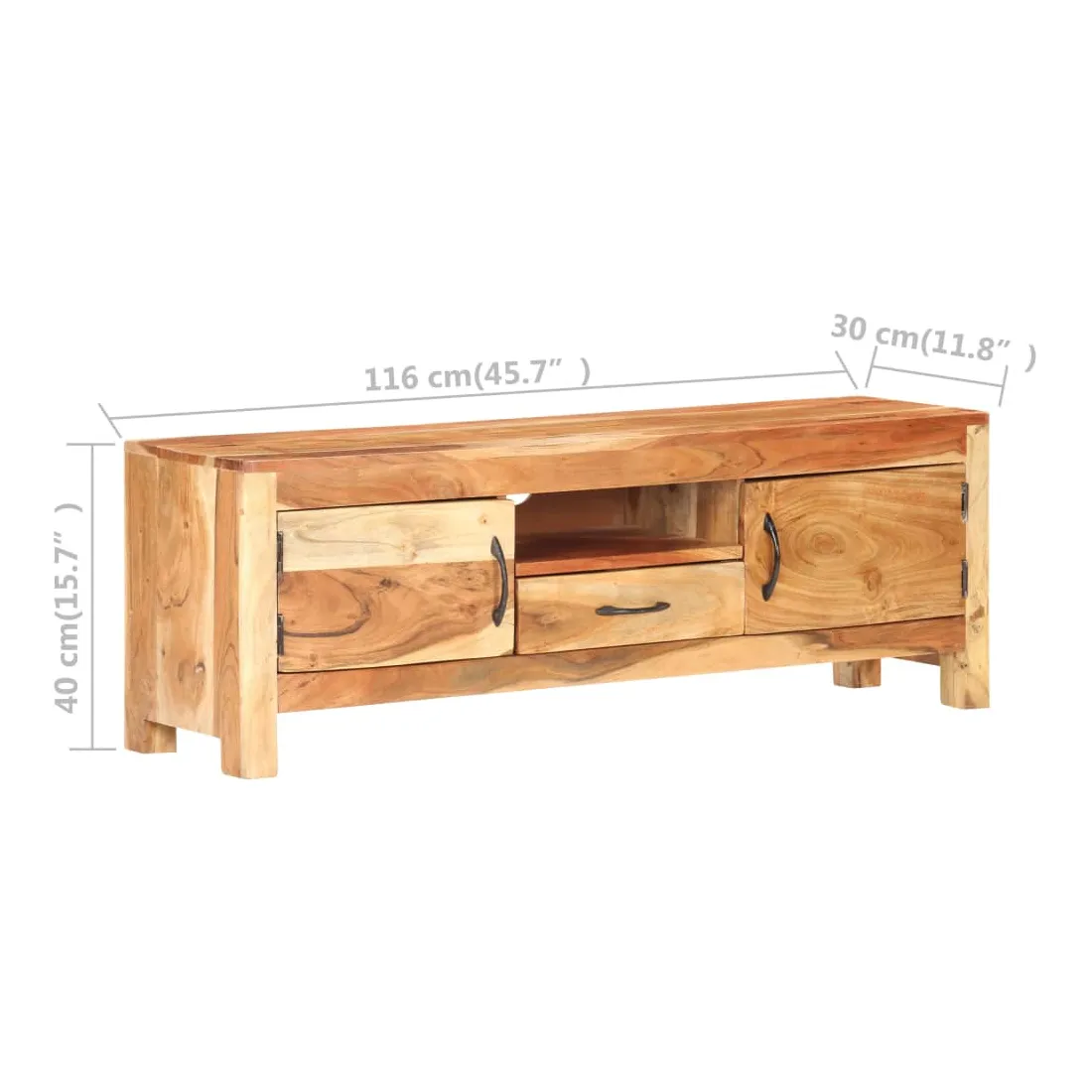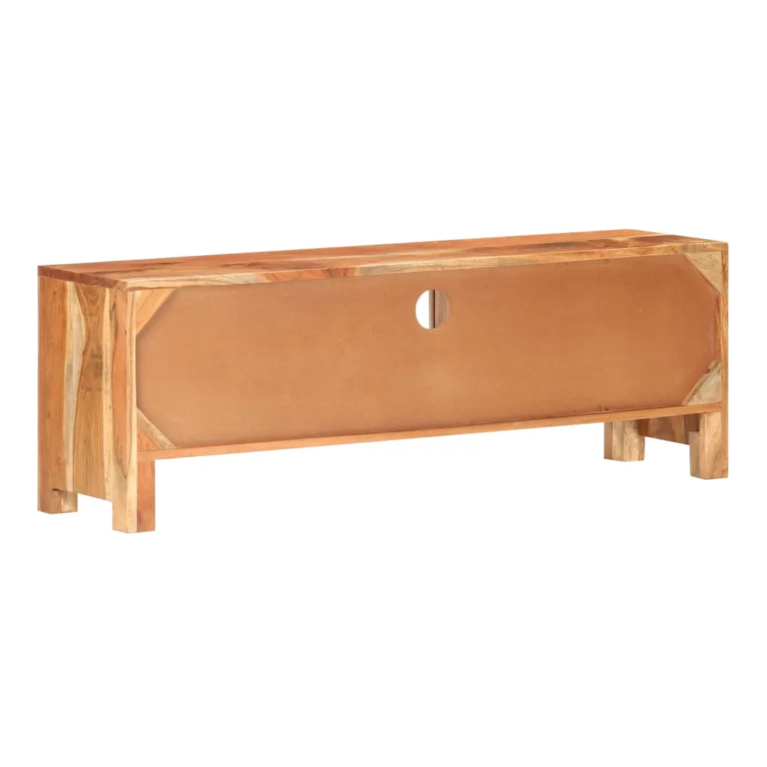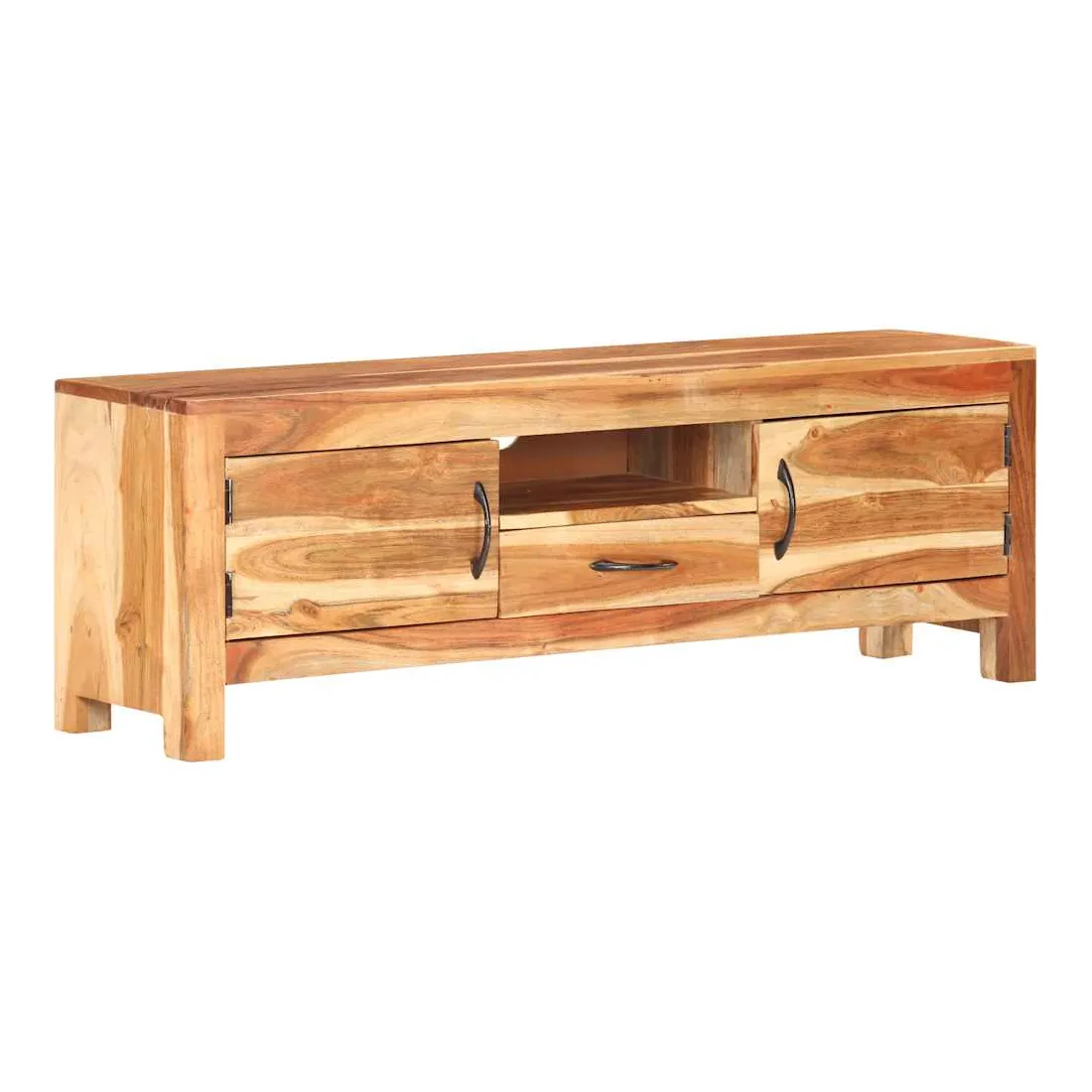 Ce meuble TV en bois présente un style classique et en fait un choix parfait pour votre espace de vie intérieur. Le meuble stéréo est fait de bois d'acacia massif avec une finition naturelle, ce qui le rend stable et durable. Le savoir-faire et les belles veines du bois rendent chaque meuble unique et légèrement différent l'un de l'autre. L’unité multimédia est également dotée de deux portes, d'un tiroir et d'une étagère offrant un vaste espace de rangement. Le dessus robuste peut être utilisé pour afficher des objets décoratifs tels que des cadres photo, des plantes en pot, des vases, etc. Remarque importante : les couleurs et les grains varient d'une pièce à l'autre, rendant chaque pièce unique. La livraison est aléatoire, ce qui garantit l'exclusivité et l'individualité de votre produit.