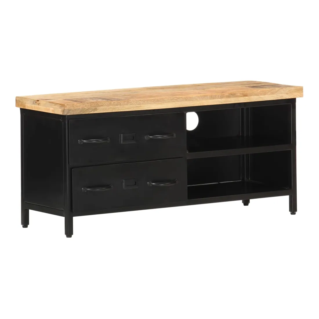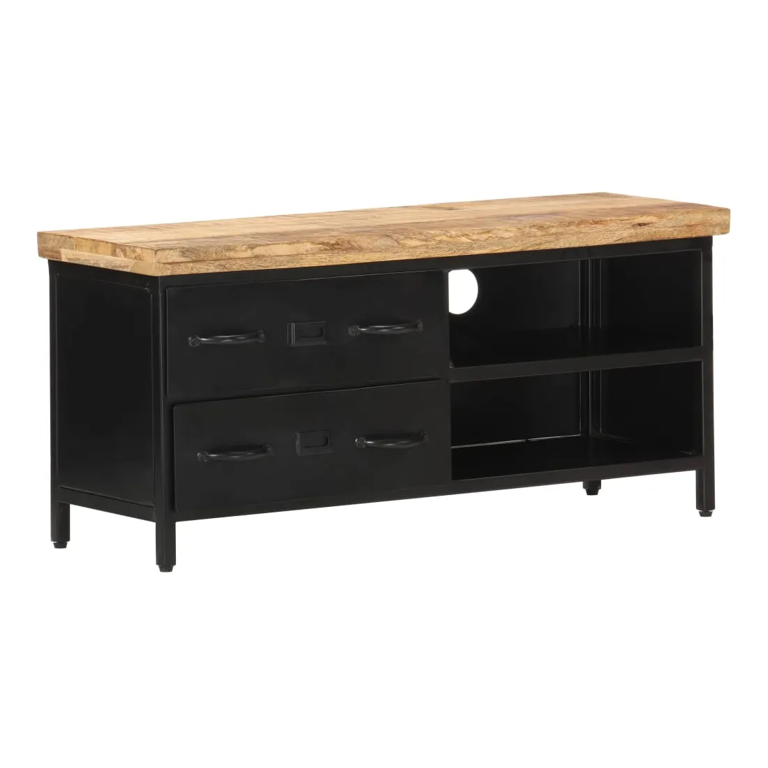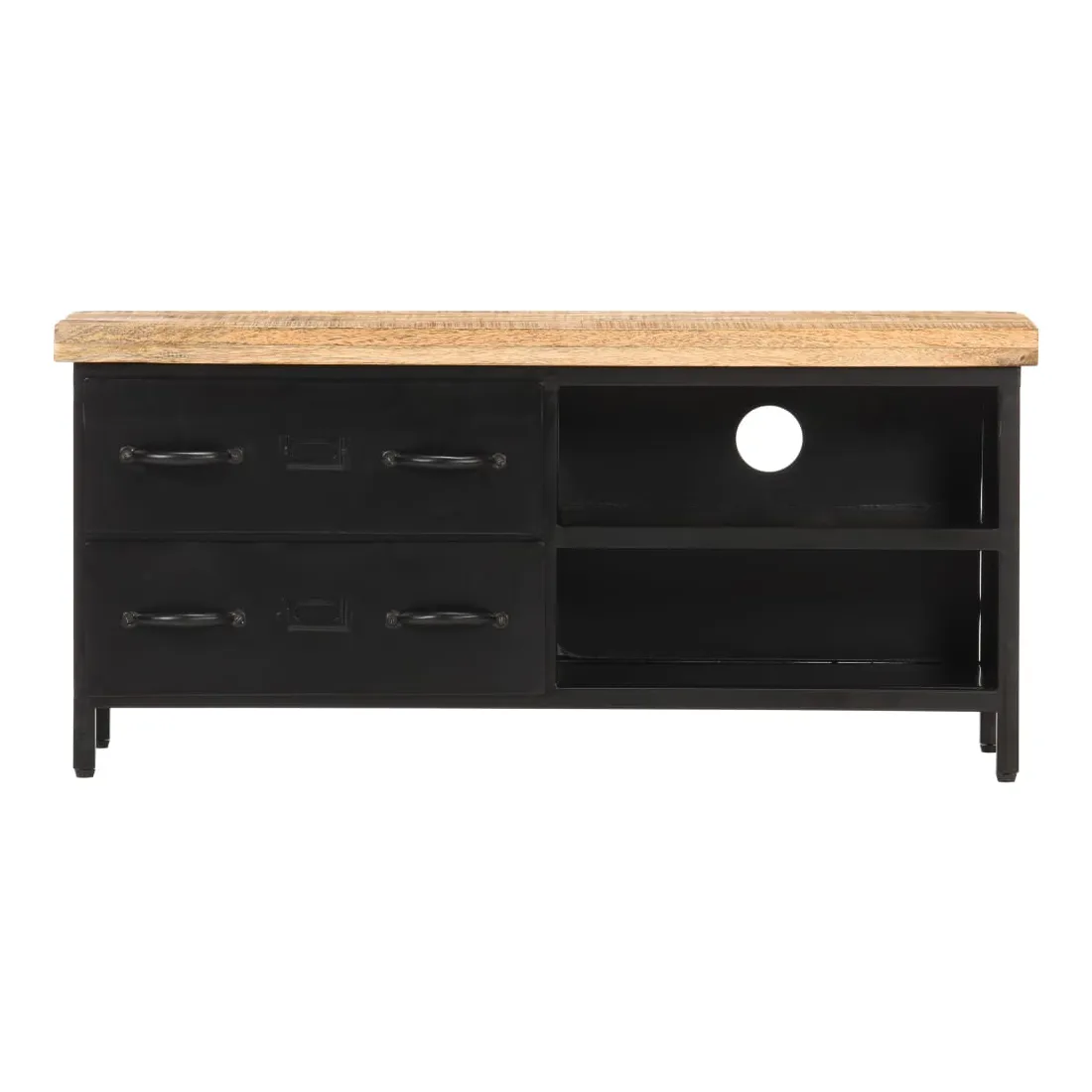 Ce meuble TV en bois ajoute un style industriel à votre chambre à coucher et salon ! L'armoire stéréo est faite de bois de manguier brut massif, un bois dur tropical avec la force de soutenir le poids. Elle résiste également à l'usure du temps, ce qui la rend stable et durable. La base en fer enduit de poudre noir combiné à l’acier offre une stabilité supplémentaire au buffet bas. Le savoir-faire artisanal et les beaux grains de bois rendent chaque meuble unique et légèrement différent l'un de l'autre. Cette unité multimédia dispose également de 2 tiroirs et de 2 compartiments, offrant un espace de rangement suffisant pour garder vos articles essentiels organisés et à portée de main. Remarque importante : les couleurs et les grains varient d'une pièce à l'autre, rendant chaque pièce unique. La livraison est aléatoire, ce qui garantit l'exclusivité et l'individualité de votre produit.