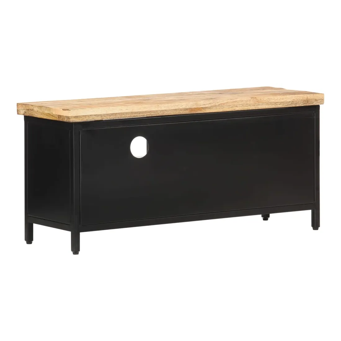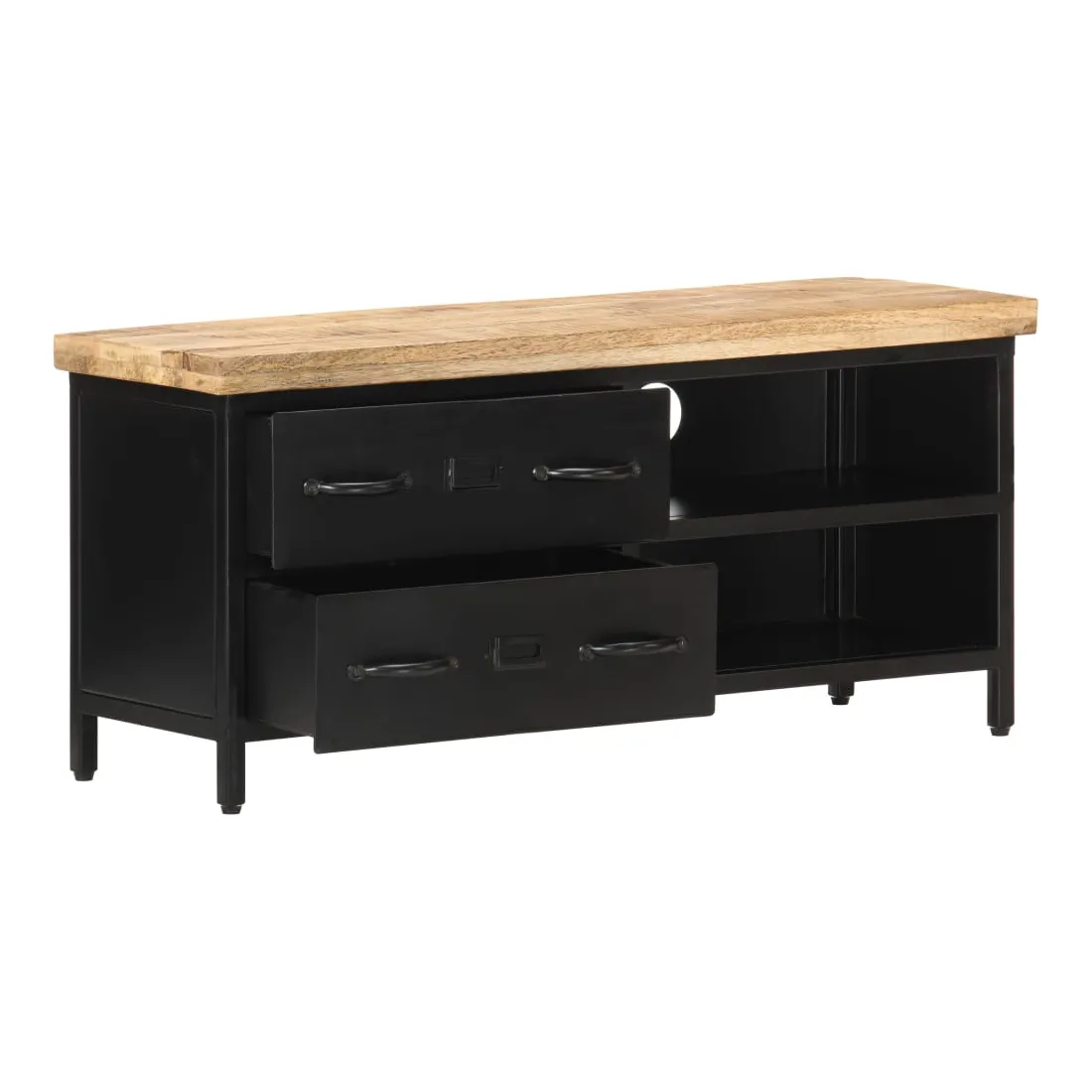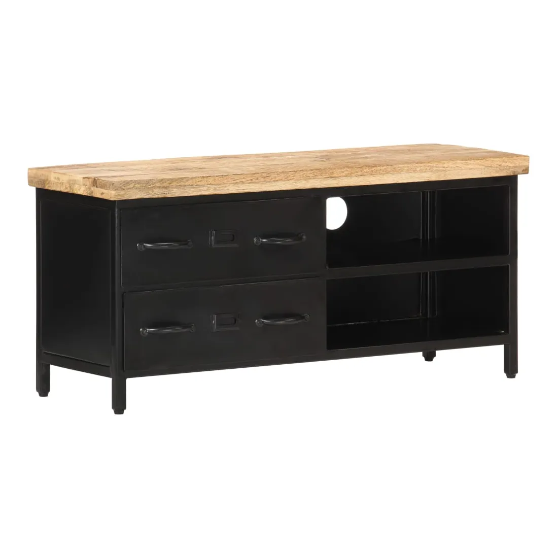 Ce meuble TV en bois ajoute un style industriel à votre chambre à coucher et salon ! L'armoire stéréo est faite de bois de manguier brut massif, un bois dur tropical avec la force de soutenir le poids. Elle résiste également à l'usure du temps, ce qui la rend stable et durable. La base en fer enduit de poudre noir combiné à l’acier offre une stabilité supplémentaire au buffet bas. Le savoir-faire artisanal et les beaux grains de bois rendent chaque meuble unique et légèrement différent l'un de l'autre. Cette unité multimédia dispose également de 2 tiroirs et de 2 compartiments, offrant un espace de rangement suffisant pour garder vos articles essentiels organisés et à portée de main. Remarque importante : les couleurs et les grains varient d'une pièce à l'autre, rendant chaque pièce unique. La livraison est aléatoire, ce qui garantit l'exclusivité et l'individualité de votre produit.