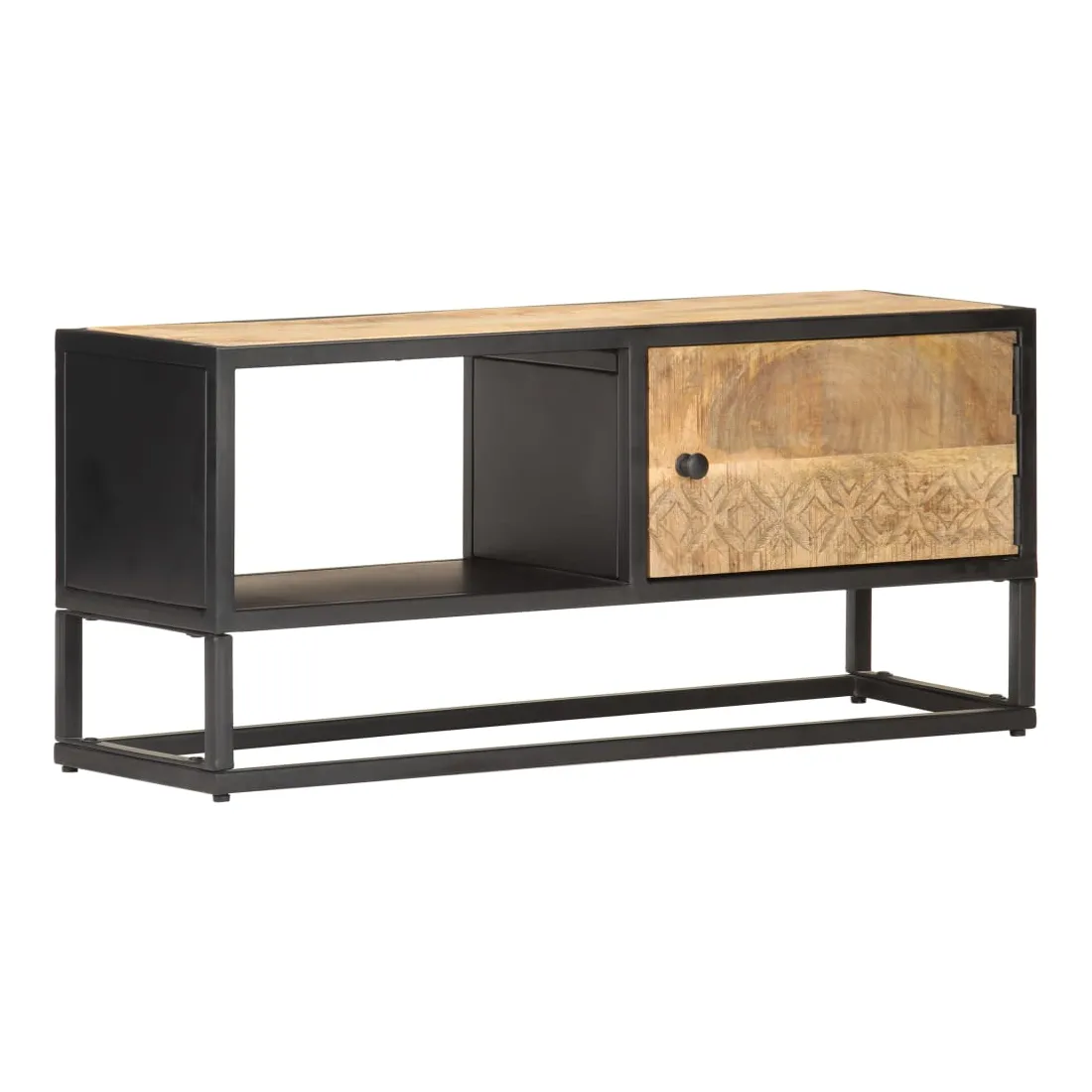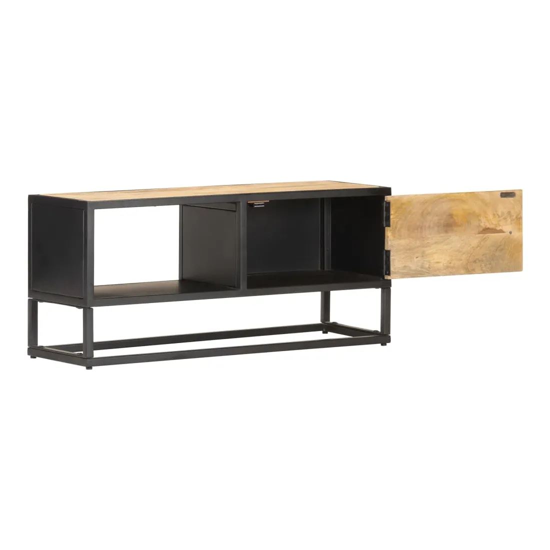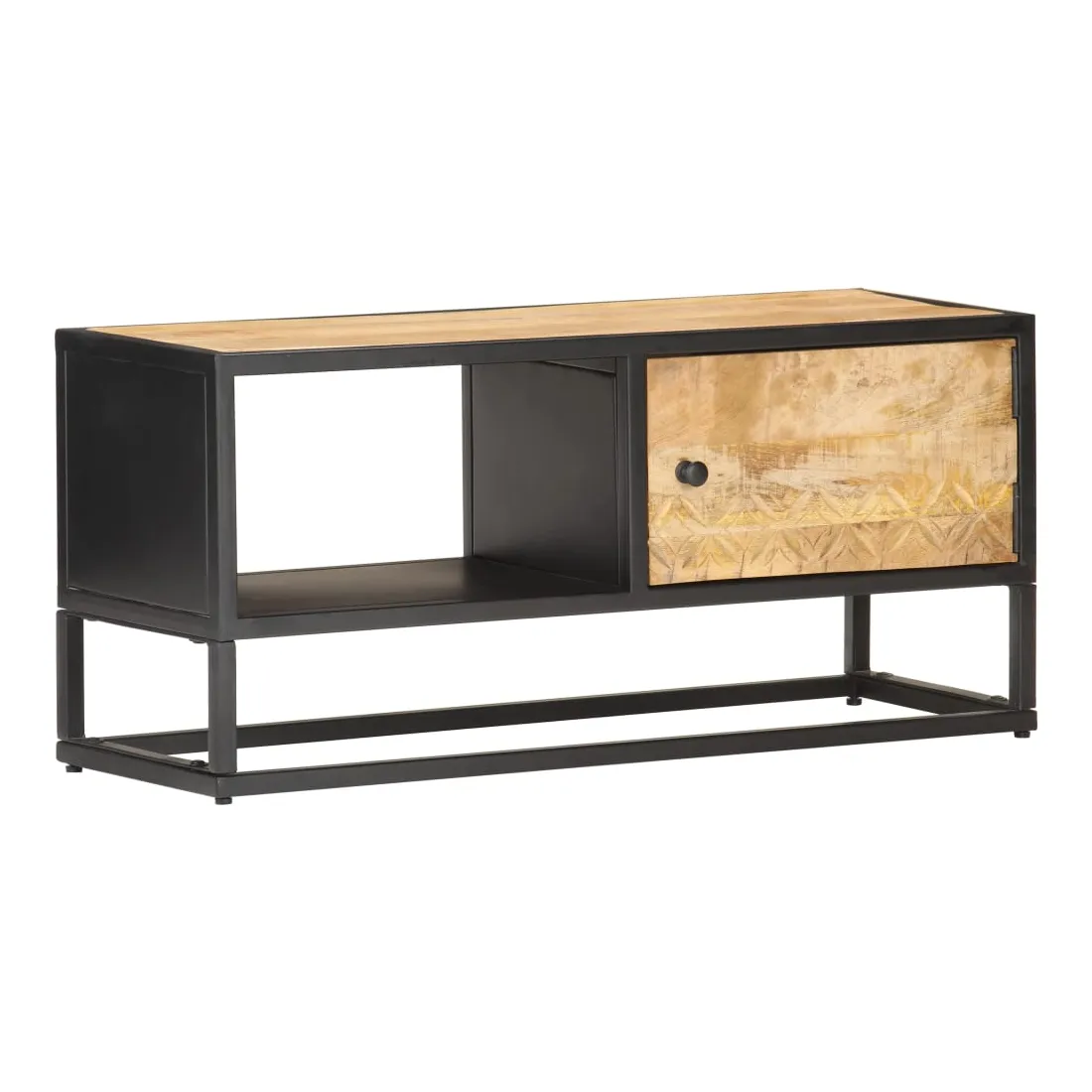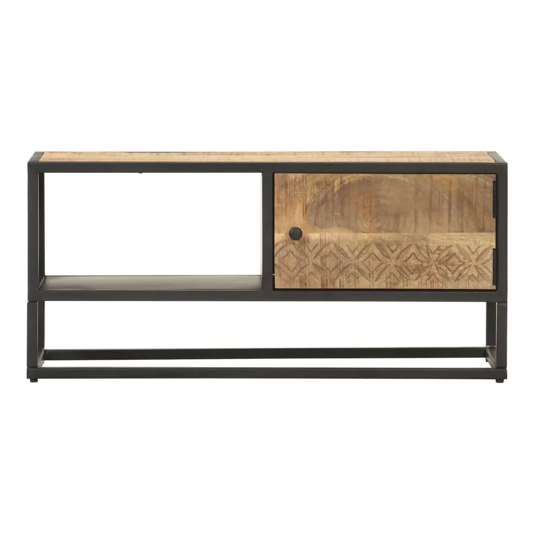 Ce meuble TV dégage un charme rustique. Il est un ajout vraiment pratique et captivant à votre intérieur. Ce meuble HiFi est fabriqué en bois de manguier brut, un bois dur à grains denses. Le bois brut de manguier possède la force nécessaire pour soutenir le poids, et résiste également à l'usure du temps. Ainsi, ce buffet au design magnifique est extrêmement stable, durable et captivant. Ce meuble stéréo est entièrement fabriqué à la main et les grains de bois esthétiquement attrayants rendent chaque meuble unique et légèrement différent l'un de l'autre. De plus, le cadre en fer enduit de poudre ajoute à sa robustesse. Cette armoire comprend 1 porte et 1 compartiment, offrant un grand espace pour ranger vos appareils multimédias, vos livres, vos chaussures ainsi que d’autres articles. Remarque importante : les couleurs varient d'une pièce à l'autre, rendant chaque meuble unique. La livraison est également aléatoire.