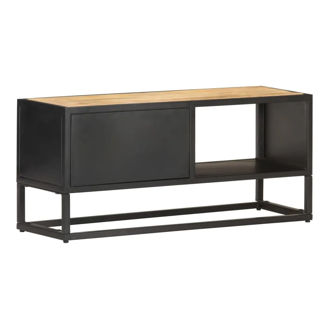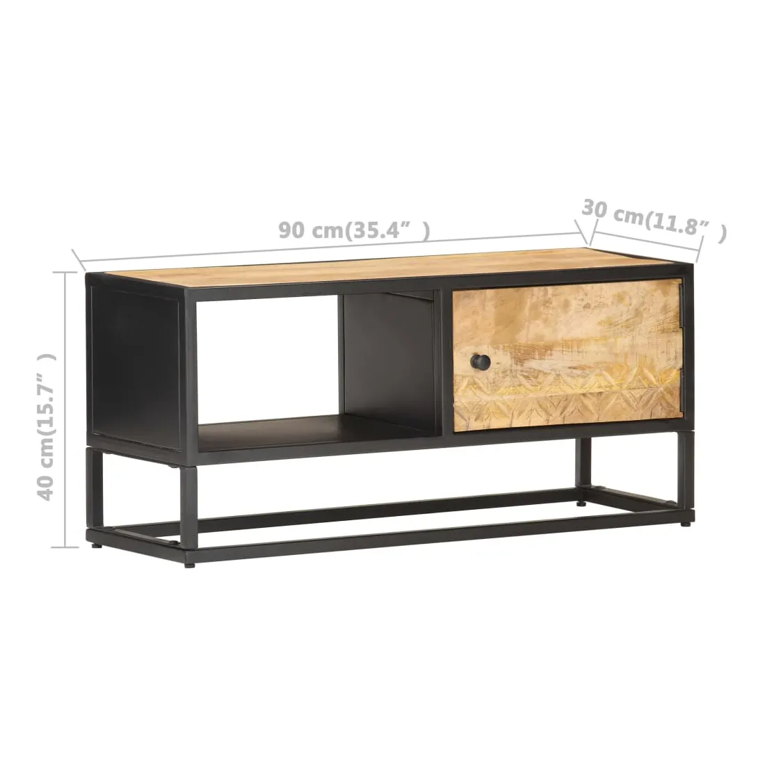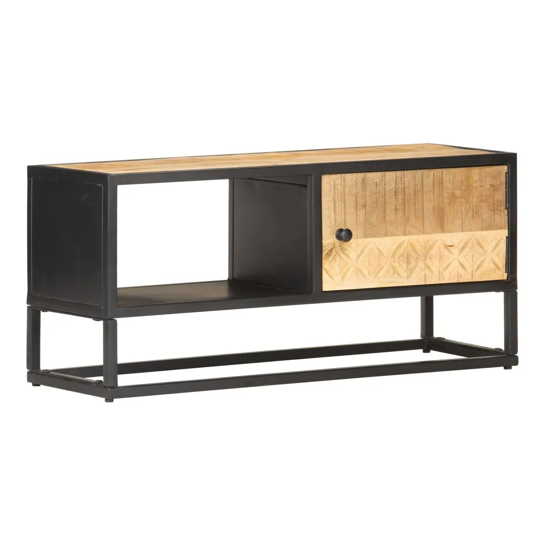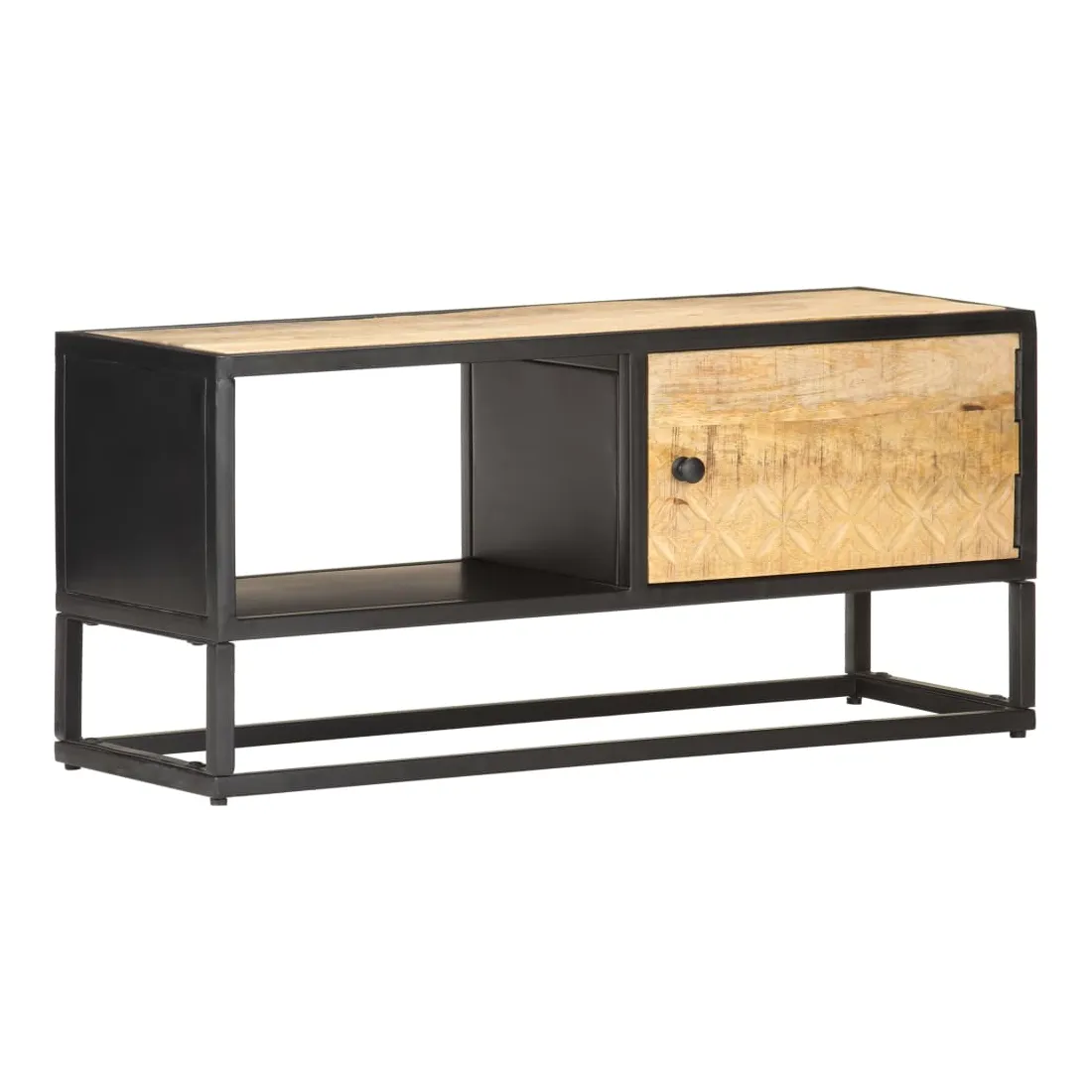 Ce meuble TV dégage un charme rustique. Il est un ajout vraiment pratique et captivant à votre intérieur. Ce meuble HiFi est fabriqué en bois de manguier brut, un bois dur à grains denses. Le bois brut de manguier possède la force nécessaire pour soutenir le poids, et résiste également à l'usure du temps. Ainsi, ce buffet au design magnifique est extrêmement stable, durable et captivant. Ce meuble stéréo est entièrement fabriqué à la main et les grains de bois esthétiquement attrayants rendent chaque meuble unique et légèrement différent l'un de l'autre. De plus, le cadre en fer enduit de poudre ajoute à sa robustesse. Cette armoire comprend 1 porte et 1 compartiment, offrant un grand espace pour ranger vos appareils multimédias, vos livres, vos chaussures ainsi que d’autres articles. Remarque importante : les couleurs varient d'une pièce à l'autre, rendant chaque meuble unique. La livraison est également aléatoire.