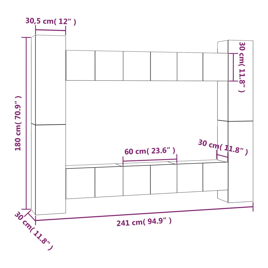 - 4 x meuble TV : 30,5 x 30 x 90 cm (l x P x H)
