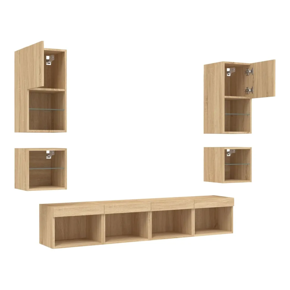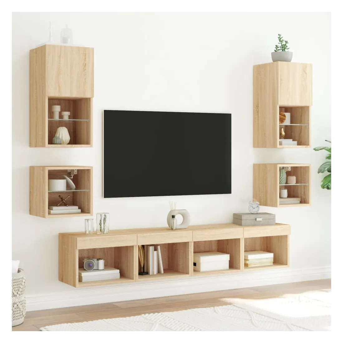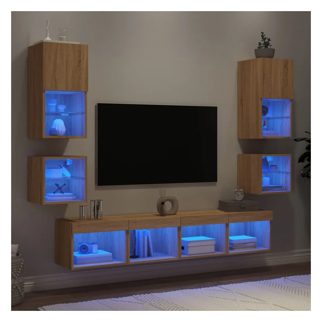 Ces unités murales TV sont la solution parfaite pour votre espace de vie afin de maximiser l'espace et de garder les surfaces au sol sans encombrement. Matériau robuste : le bois d'ingénierie est d'une qualité exceptionnelle avec une surface lisse et présente également résistance, stabilité et résistance à l'humidité.Lumières LED RVB : la unité TV est équipée de lumières LED RVB vibrantes. Avec divers menus personnalisables, vous pouvez changer sans effort la couleur des lumières et même les régler automatiquement. Ces lumières LED renforcent non seulement l'aspect contemporain du meuble TV flottant, mais aussi son attrait pour la mode.Design mural : le meuble de télévision peut être fixé au mur pour ajouter un espace de stockage supplémentaire. De cette façon, vous pouvez maximiser votre espace au sol et garder la zone propre.Grand espace de rangement : le meuble TV flottant est doté de différentes options de rangement, offrant ainsi un grand espace pour ranger vos objets quotidiens tels que les livres, les DVD, les accessoires multimédias et d'autres articles bien organisés et à portée de main.Design polyvalent : vous pouvez l'utiliser comme meuble TV ou le monter sur le mur du lieu de travail pour un rangement pratique des outils ou d'autres articles divers. En outre, il transforme un mur vide en élément de design. Bon à savoir :Les vis et les chevilles pour l'intérieur du mur ne sont pas incluses. Nous vous conseillons de trouver et d'utiliser des vis et des chevilles adaptées spécifiquement à vos murs. Si vous n'êtes pas sûr, vous pouvez consulter un professionnel. Veuillez lire et suivre chaque étape des instructions.Ce produit est doté d'un connecteur USB qui nécessite une source d'alimentation USB de 5V certifiée (non incluse).