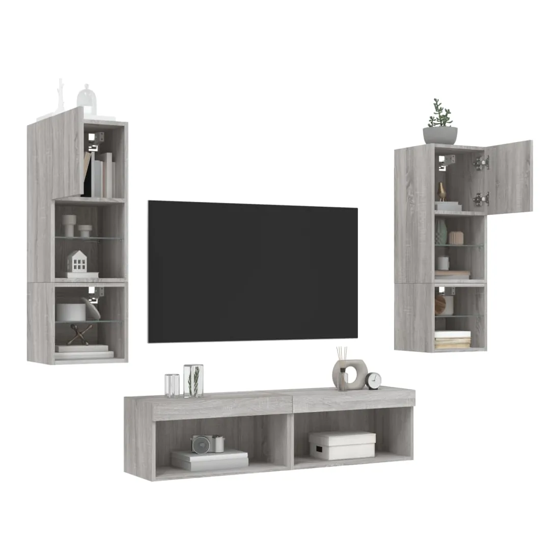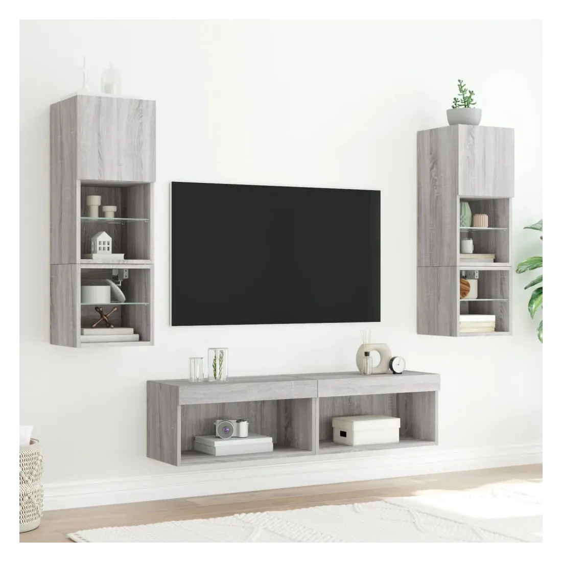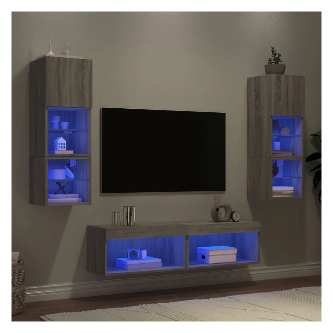 Ces unités murales TV sont la solution parfaite pour votre espace de vie afin de maximiser l'espace et de garder les surfaces au sol sans encombrement. Matériau robuste : le bois d'ingénierie est d'une qualité exceptionnelle avec une surface lisse et présente également résistance, stabilité et résistance à l'humidité.Lumières LED RVB : la unité TV est équipée de lumières LED RVB vibrantes. Avec divers menus personnalisables, vous pouvez changer sans effort la couleur des lumières et même les régler automatiquement. Ces lumières LED renforcent non seulement l'aspect contemporain du meuble TV flottant, mais aussi son attrait pour la mode.Design mural : le meuble de télévision peut être fixé au mur pour ajouter un espace de stockage supplémentaire. De cette façon, vous pouvez maximiser votre espace au sol et garder la zone propre.Grand espace de rangement : le meuble TV flottant est doté de différentes options de rangement, offrant ainsi un grand espace pour ranger vos objets quotidiens tels que les livres, les DVD, les accessoires multimédias et d'autres articles bien organisés et à portée de main.Design polyvalent : vous pouvez l'utiliser comme meuble TV ou le monter sur le mur du lieu de travail pour un rangement pratique des outils ou d'autres articles divers. En outre, il transforme un mur vide en élément de design. Bon à savoir :Les vis et les chevilles pour l'intérieur du mur ne sont pas incluses. Nous vous conseillons de trouver et d'utiliser des vis et des chevilles adaptées spécifiquement à vos murs. Si vous n'êtes pas sûr, vous pouvez consulter un professionnel. Veuillez lire et suivre chaque étape des instructions.Ce produit est doté d'un connecteur USB qui nécessite une source d'alimentation USB de 5V certifiée (non incluse).