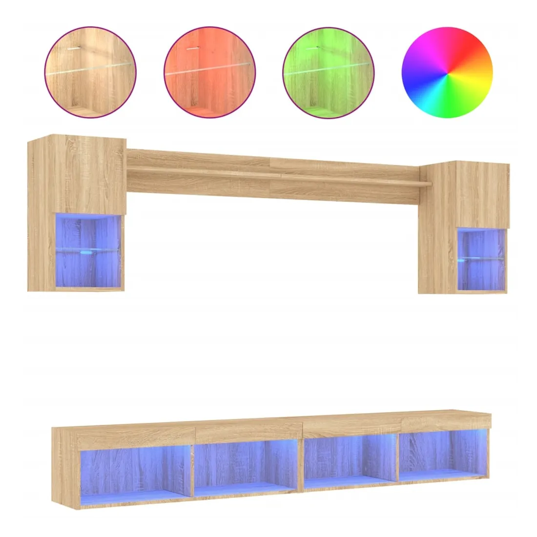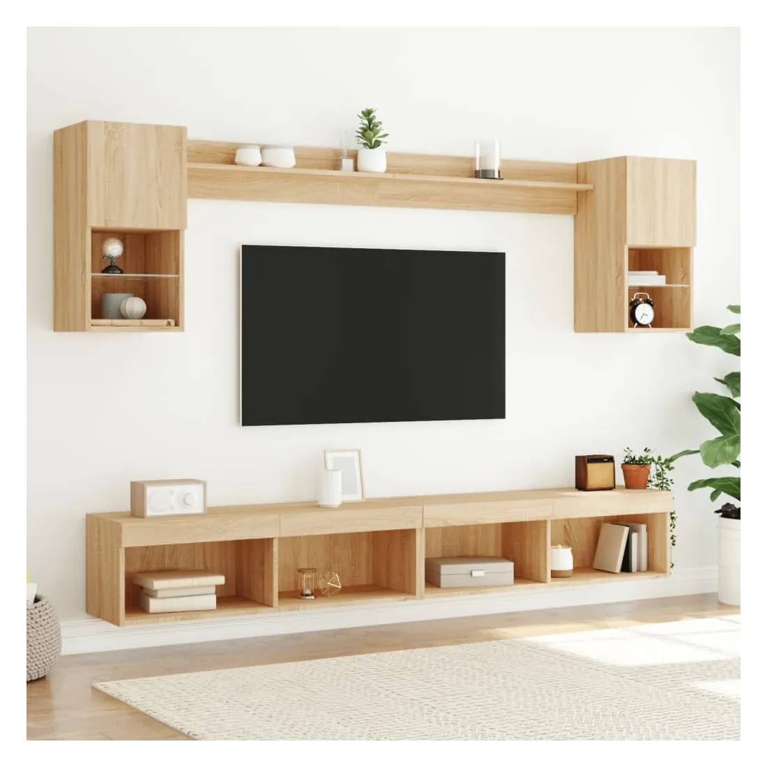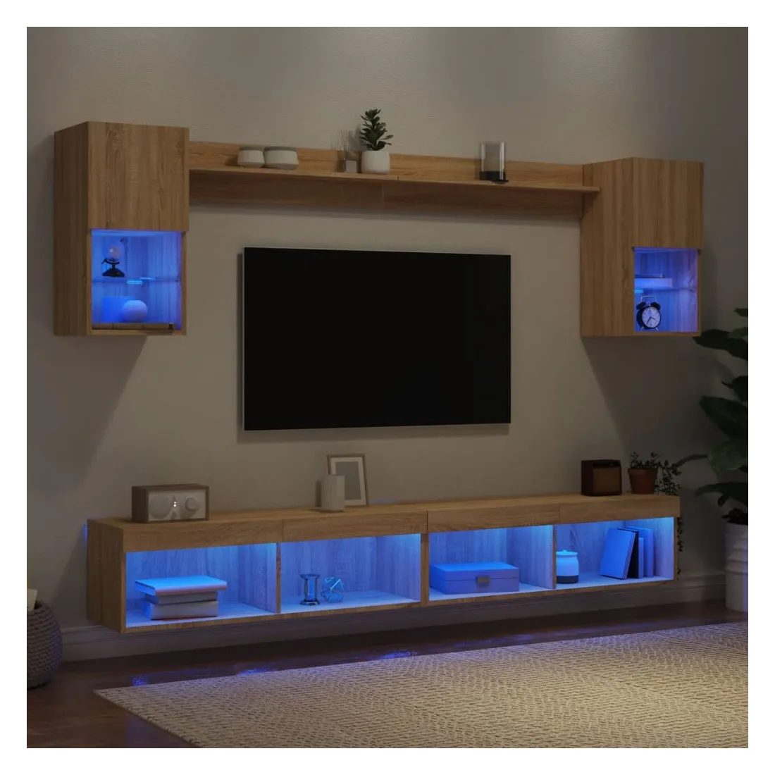 Ces unités murales TV sont la solution parfaite pour votre espace de vie afin de maximiser l'espace et de garder les surfaces au sol sans encombrement. Matériau robuste : le bois d'ingénierie est d'une qualité exceptionnelle avec une surface lisse et présente également résistance, stabilité et résistance à l'humidité.Lumières LED RVB : la unité TV est équipée de lumières LED RVB vibrantes. Avec divers menus personnalisables, vous pouvez changer sans effort la couleur des lumières et même les régler automatiquement. Ces lumières LED renforcent non seulement l'aspect contemporain du meuble TV flottant, mais aussi son attrait pour la mode.Design mural : le meuble de télévision peut être fixé au mur pour ajouter un espace de stockage supplémentaire. De cette façon, vous pouvez maximiser votre espace au sol et garder la zone propre.Grand espace de rangement : le meuble TV flottant est doté de différentes options de rangement, offrant ainsi un grand espace pour ranger vos objets quotidiens tels que les livres, les DVD, les accessoires multimédias et d'autres articles bien organisés et à portée de main.Design polyvalent : vous pouvez l'utiliser comme meuble TV ou le monter sur le mur du lieu de travail pour un rangement pratique des outils ou d'autres articles divers. De plus, il transforme un mur vide en un élément de décoration. Bon à savoir :Les vis et les chevilles pour l'intérieur du mur ne sont pas incluses. Nous vous conseillons de trouver et d'utiliser des vis et des chevilles adaptées spécifiquement à vos murs. Si vous n'êtes pas sûr, vous pouvez consulter un professionnel. Veuillez lire et suivre chaque étape des instructions.Ce produit est doté d'un connecteur USB qui nécessite une source d'alimentation USB de 5V certifiée (non incluse).