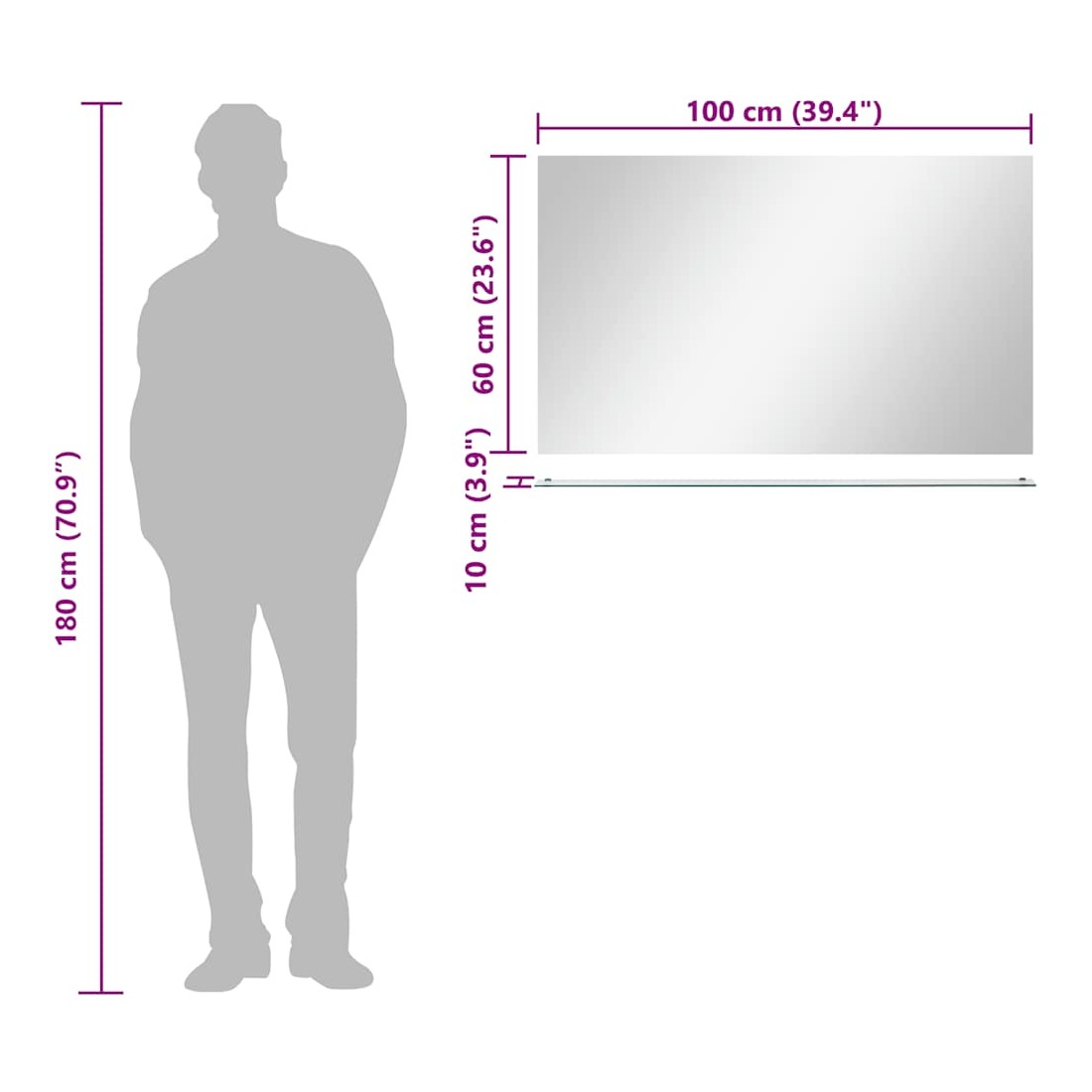 Notre miroir mural avec étagère sera un supplément pratique et décoratif à votre salle de bain, salon ou chambre à coucher. Le mobilier de salle de bain présente un style minimaliste et une étagère en miroir pratique pour afficher des objets décoratifs ou les essentiels du dressing. De conception contemporaine, notre miroir de salle de bain avec étagère est fabriqué en verre trempé, ce qui assure sa durabilité. Le miroir peut être facilement monté sur le mur.