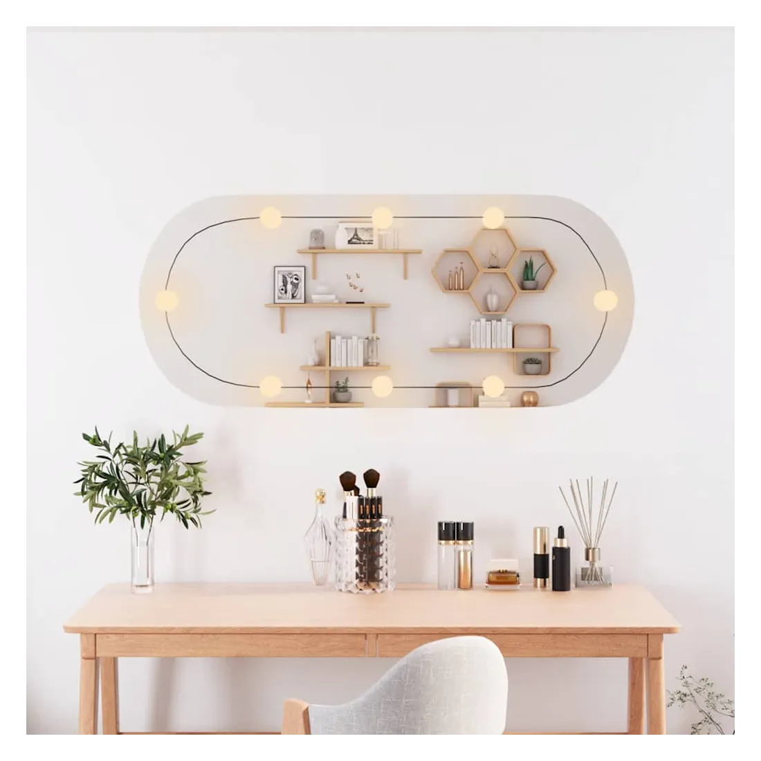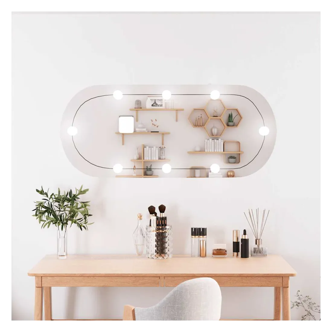 Le miroir mural élégant avec lumières LED ajoute une touche de style contemporain et fournit une lumière vive à votre pièce ! Design mural : le miroir est équipé de pinces pour le montage mural, ce qui le rend particulièrement adapté aux pièces avec un espace limité.Image claire : le miroir de maquillage offre une image claire. Ainsi, vous pouvez profiter d'un reflet magnifique et naturel lorsque vous vous tenez devant le miroir de courtoisie.Différents modes de couleur : la lumière du miroir de courtoisie a différents modes de couleur pour répondre à vos besoins en fonction de la situation. Une température de couleur blanche chaude est confortable et accueillante, tandis que le blanc froid contribue à la vigilance et à la sécurité.Interface USB pratique : les lumières LED sont équipées d'une interface USB, ce qui les rend très pratiques à utiliser.Usages multiples : vous pouvez utiliser le miroir de décoration pour décorer votre chambre à coucher, armoire, couloir, salon, salle de bain et tout autre endroit où vous avez besoin d'ajouter de la brillance. Bon à savoir :Les vis et les chevilles pour l'intérieur du mur ne sont pas incluses. Nous vous conseillons de trouver et d'utiliser des vis et des chevilles adaptées spécifiquement à vos murs. Si vous n'êtes pas sûr, vous pouvez consulter un professionnel. Veuillez lire et suivre chaque étape des instructions.