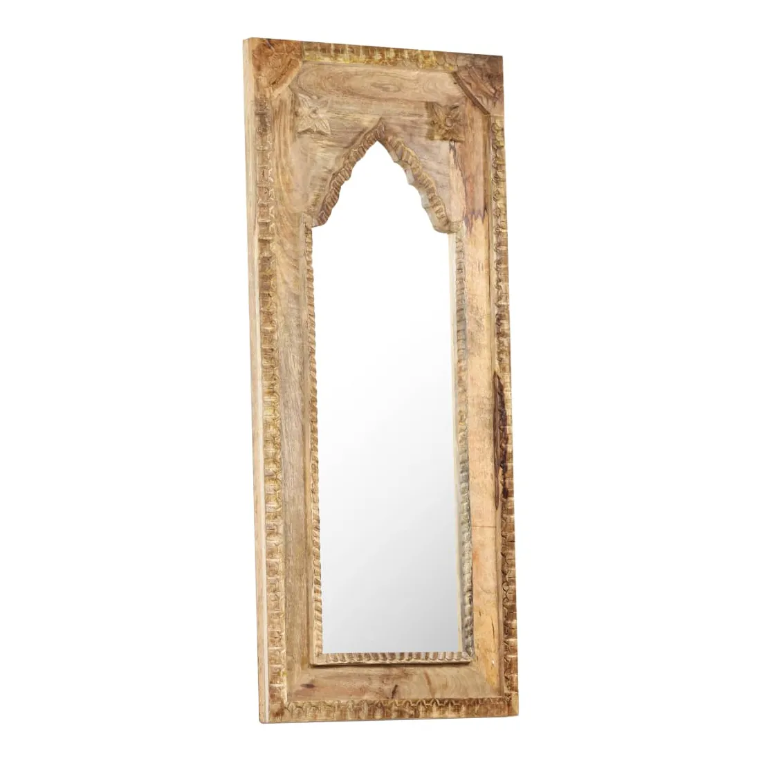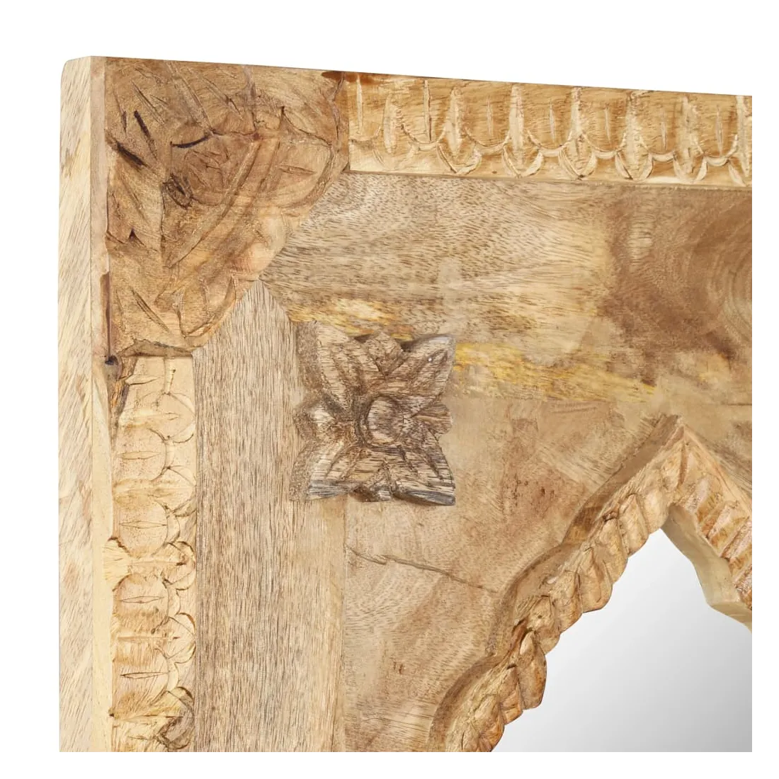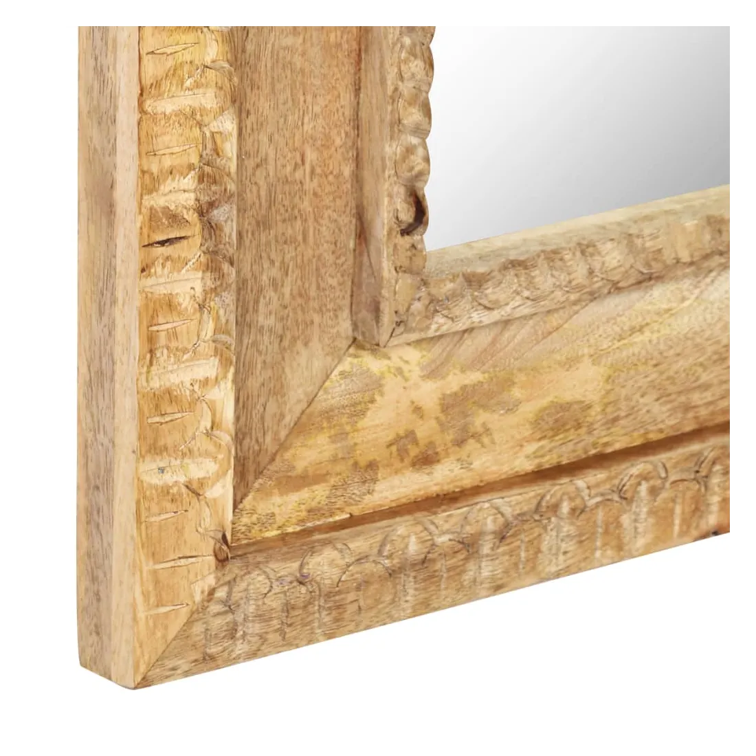 Ce magnifique miroir en bois dégage un charme unique et ajoutera un grand plus à votre maison. Le cadre du miroir est en bois de manguier massif, un bois dur à grains denses. Le bois de manguier massif a non seulement assez de force pour soutenir le poids, mais résiste aussi à l’usure du temps. Le bois a été méticuleusement sculpté à la main, ce qui ajoute encore plus de charme. Le miroir peut être placé dans la salle de bain, la chambre à coucher ou le salon, servant de miroir cosmétique ou de miroir de décoration. Remarque importante : le couleur et les grains de bois peuvent varier d'une pièce à l'autre, ce qui rend chaque pièce unique et légèrement différente l'une de l'autre ; la livraison est aléatoire.