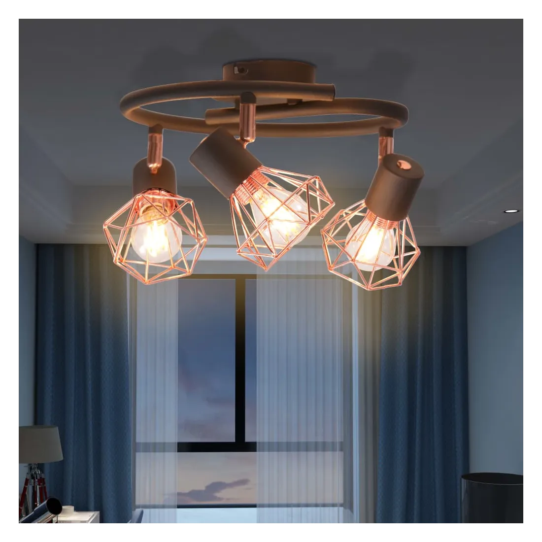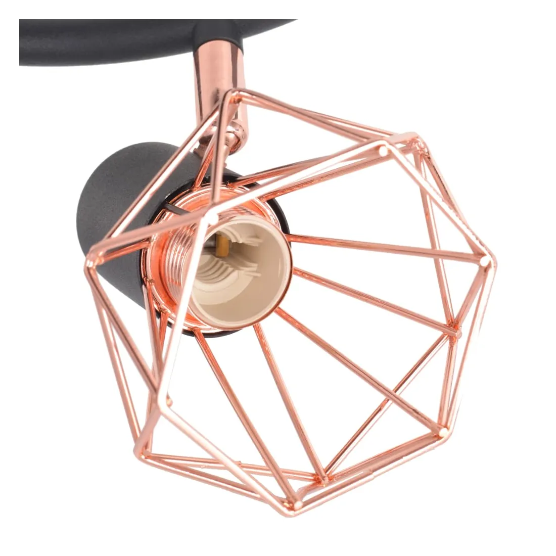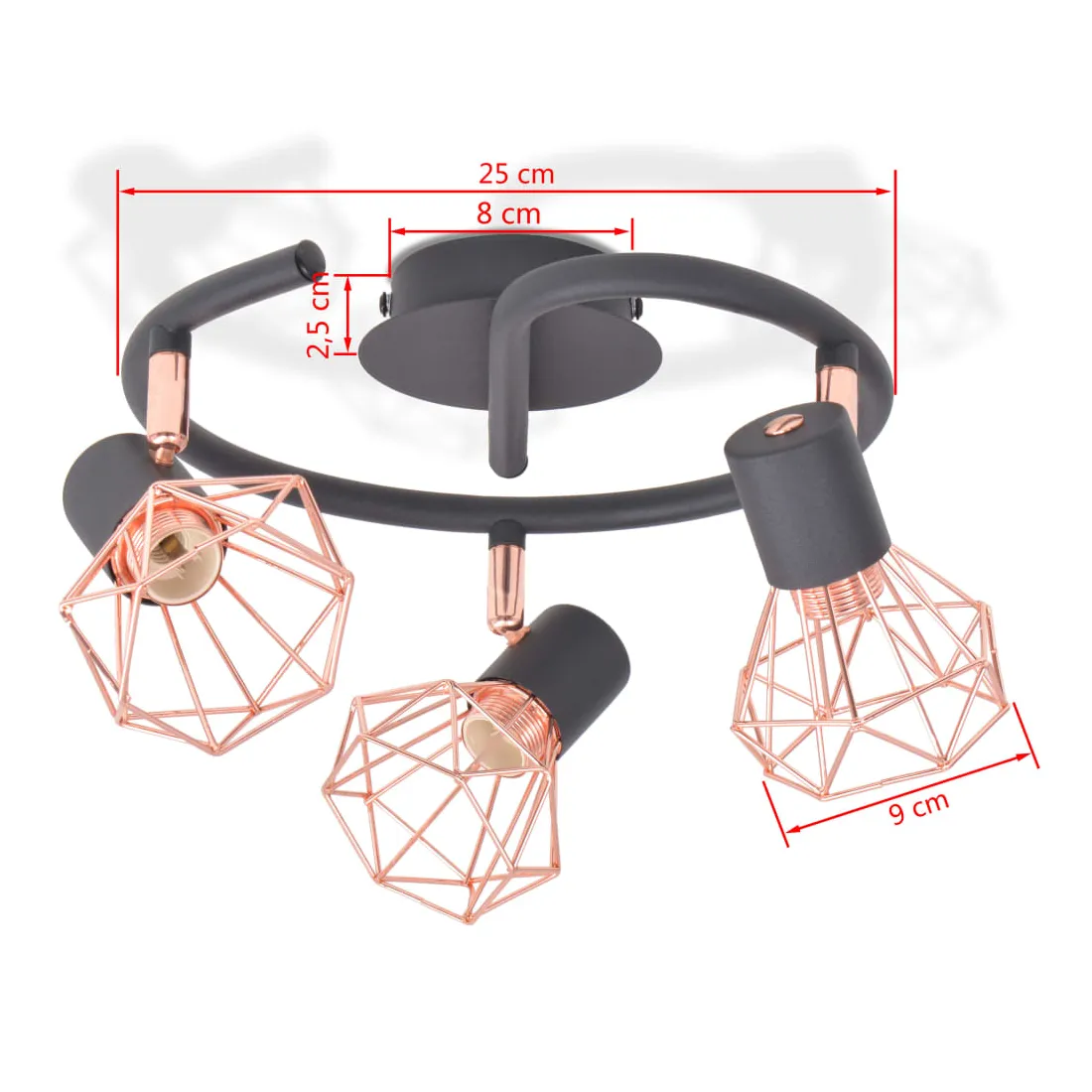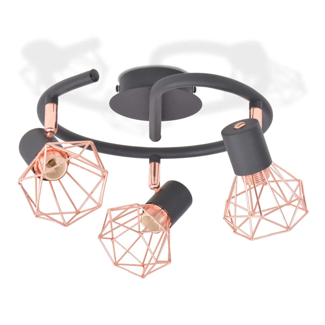 Ce plafonnier avec 3 projecteurs présente un design industriel et améliorera le look de n'importe quelle pièce. La lampe peut être facilement montée au mur ou au plafond grâce à sa base en métal noir de haute qualité. Les abats-jour des projecteurs uniques en fil de fer cuivré ajoutent à son style industriel et créent un effet agréable, lorsque la lumière est émise à travers eux pour éclairer chaque coin de la pièce. Cette lampe convient aux ampoules E14, mais veuillez noter que les ampoules ne sont pas incluses dans la livraison.