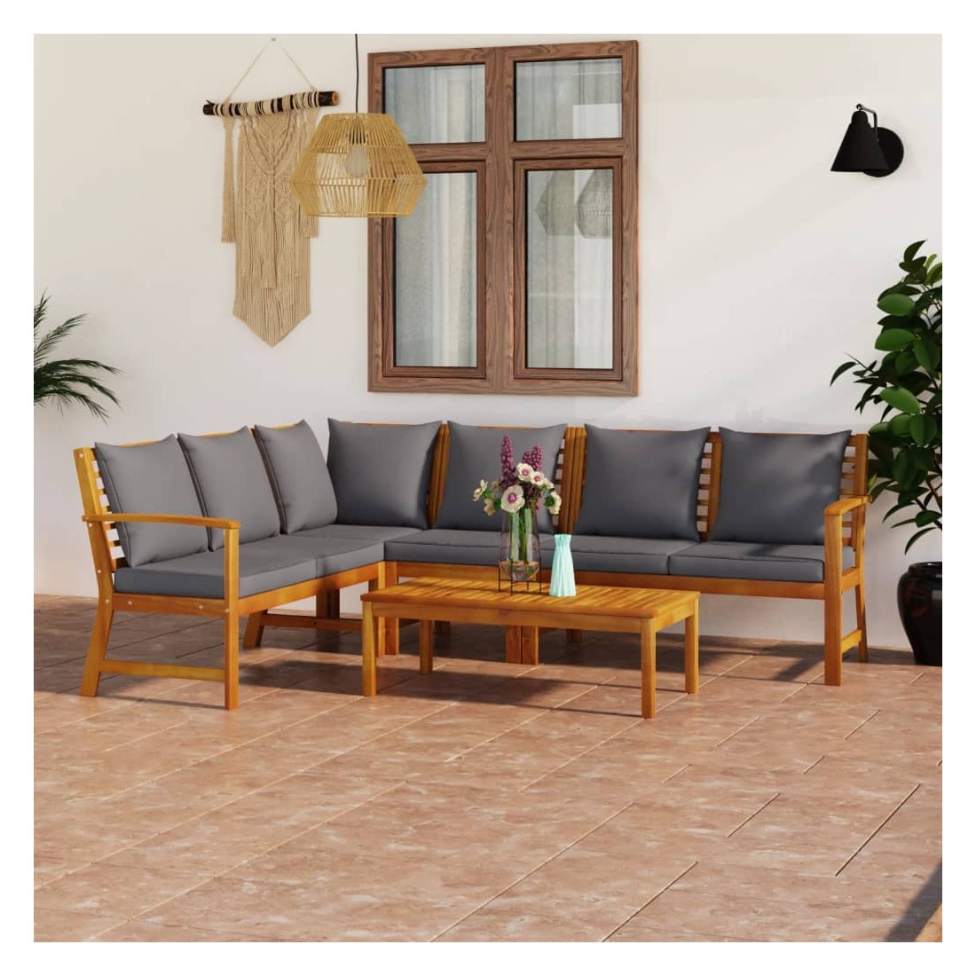 Cet ensemble de salon de jardin de 5 pièces sera un excellent supplément à votre espace de vie extérieur. Il ajoutera une touche d'élégance moderne à votre patio, balcon ou jardin avec son design élégant. Doté d’un cadre en bois d’acacia massif, l’ensemble de canapés est solide, robuste et durable; et sa finition à l'huile rend l’ensemble de canapés adapté à une utilisation à l'extérieur. Une table basse au design unique à lattes est également incluse. Vous pouvez mettre quelques collations, boissons, tasses à thé, livre, etc, sur la table basse et garder tous les essentiels à portée de main. Cet ensemble est livré avec des coussins d’assise et de dossier rembourrés très confortables. Les housses en polyester à faible entretien peuvent également être retirées et lavées. De plus, grâce