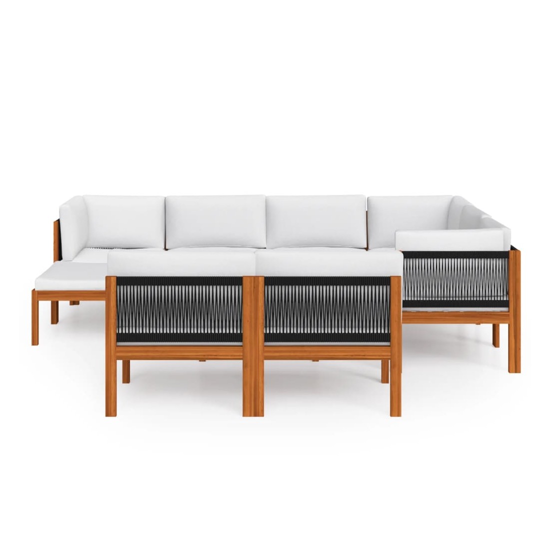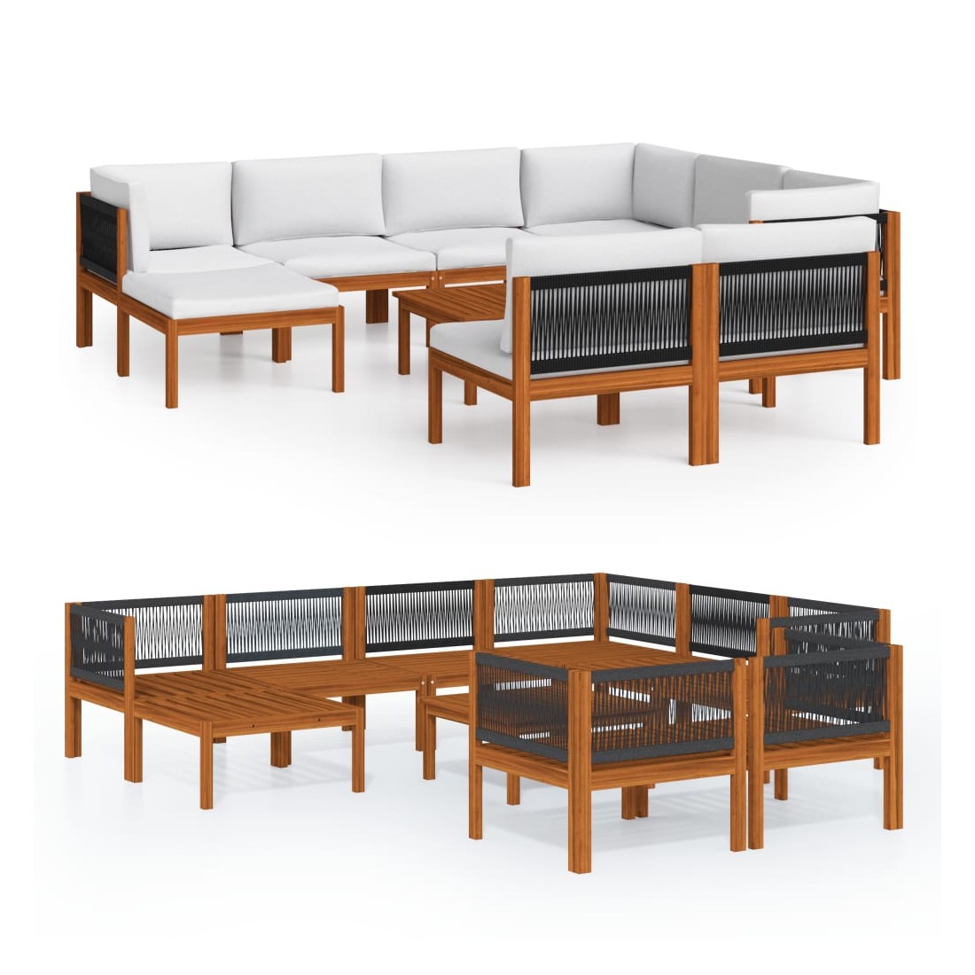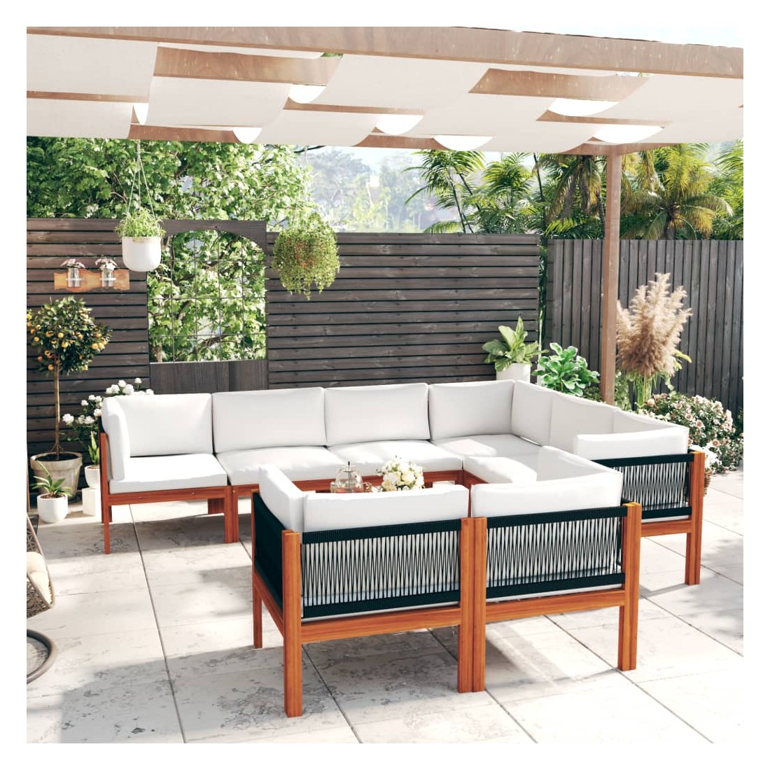 Salon de jardin 10 pièces avec coussins, bois crème, acacia et corde