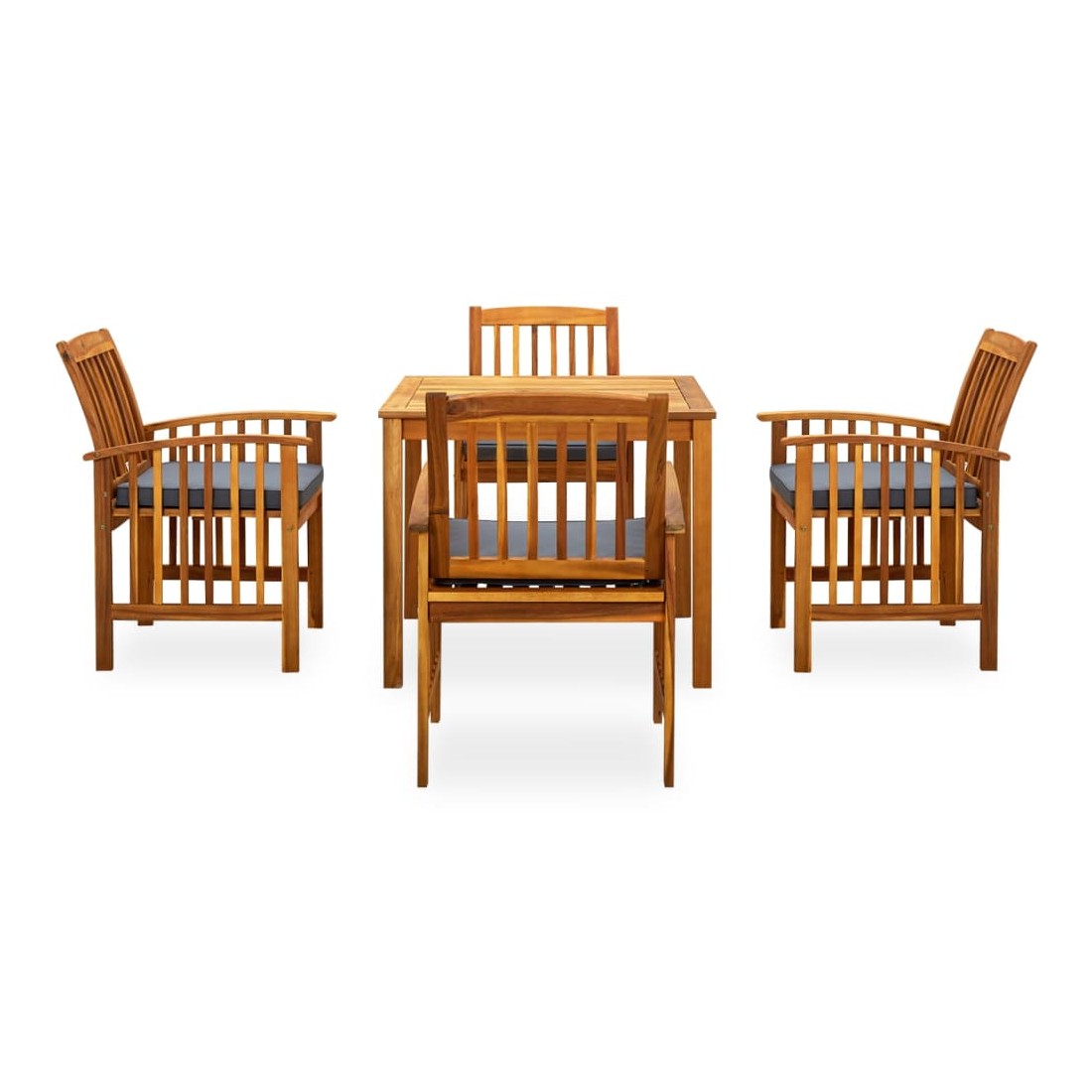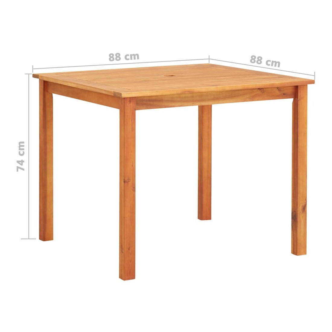 Créez une esthétique convaincante et uniforme dans votre espace extérieur avec cet ensemble de salle à manger de jardin ! La table de salle à manger est en bois d'acacia massif, un bois dur aux grains denses, ce qui la rend robuste, durable et facile à entretenir. Le dessus en bois peut être utilisé pour placer des aliments, des boissons et d'autres articles. Dotées d'un cadre en bois avec une finition à l'huile, ces chaises de salle à manger apportent un look classique à votre terrasse ou à votre arrière-cour tout en donnant à votre espace extérieur une sensation naturelle. Les coussins bien rembourrés ajoutent également un confort d'assise supplémentaire pendant votre temps de détente. De plus, cet ensemble est facile à nettoyer avec un chiffon humide. Remarque : afin de prolonger la