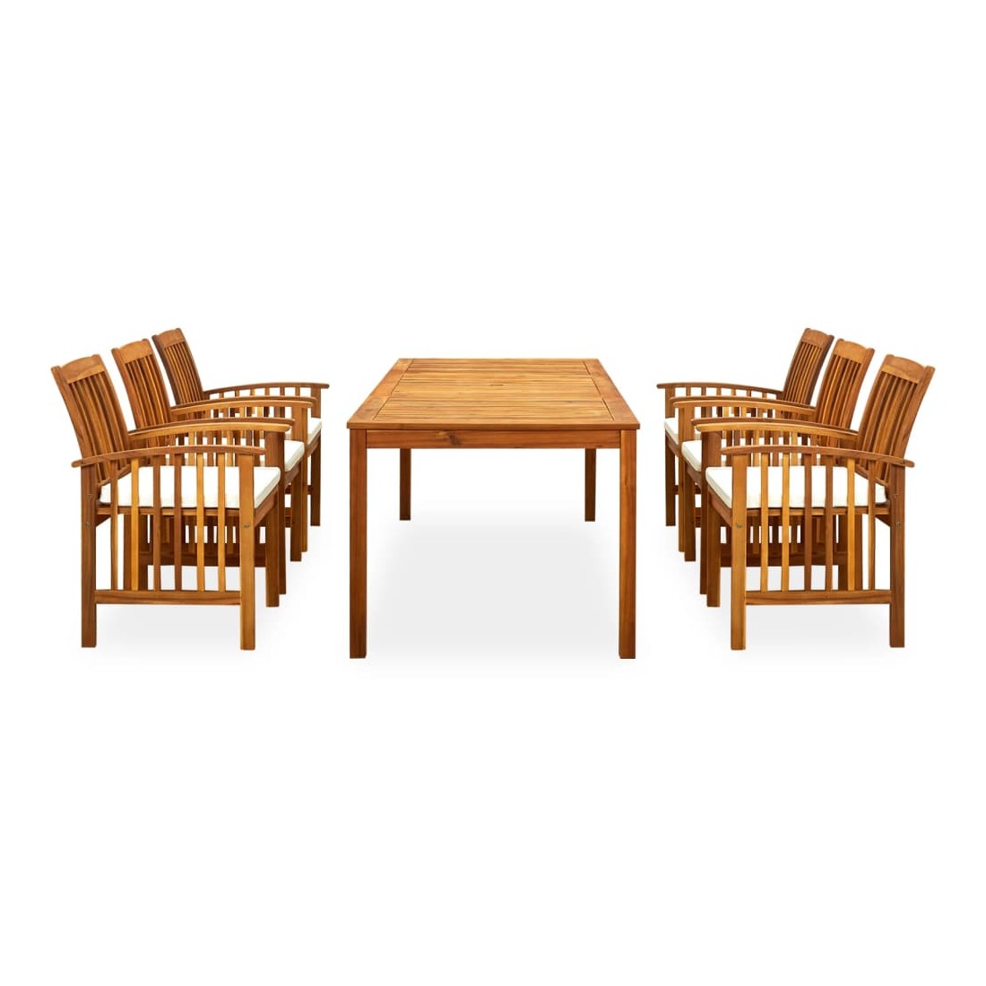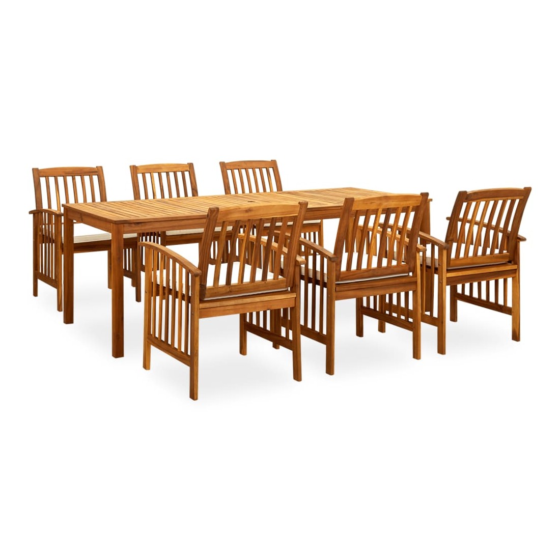 Créez une esthétique convaincante et uniforme dans votre espace extérieur avec cet ensemble de salle à manger de jardin ! La table de salle à manger est en bois d'acacia massif, un bois dur aux grains denses, ce qui la rend robuste, durable et facile à entretenir. Le dessus en bois peut être utilisé pour placer des aliments, des boissons et d'autres articles. Dotées d'un cadre en bois avec une finition à l'huile, ces chaises de salle à manger apportent un look classique à votre terrasse ou à votre arrière-cour tout en donnant à votre espace extérieur une sensation naturelle. Les coussins bien rembourrés ajoutent également un confort d'assise supplémentaire pendant votre temps de détente. De plus, cet ensemble est facile à nettoyer avec un chiffon humide. Remarque : afin de prolonger la durée de vie des meubles d'extérieur, nous vous recommandons de les protéger avec une housse imperméable.