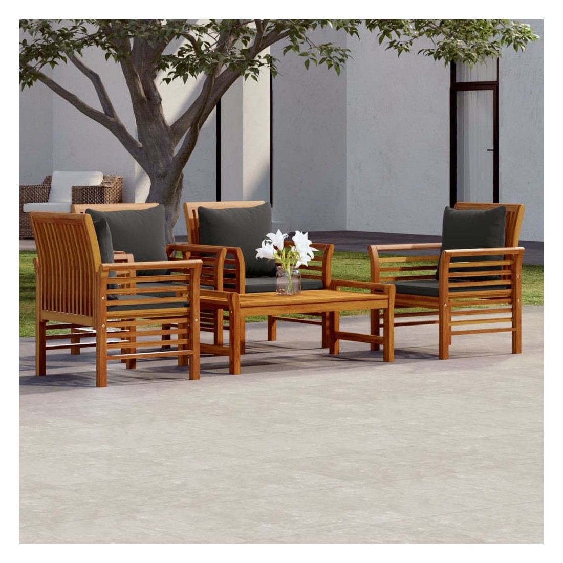 Ce salon de jardin combine style et fonctionnalité et est un choix idéal pour vous détendre, profiter du beau temps, faire une sieste ou discuter avec votre famille ou vos amis. Matériau pratique : le bois d'acacia massif est un matériau naturel magnifique. Le bois d'acacia un bois dur tropical, qui est dense, robuste et durable.Confort supplémentaire : grâce à la tapisserie 100 % polyester et au rembourrage épais, les coussins inclus sont doux et offrent le plus grand confort.Table de loisirs idéale : avec un dessus robuste, la table est idéale pour garder la nourriture et les boissons à portée de main lorsque vous vous détendez en plein air. Remarque :Afin de prolonger la durée de vie de votre mobilier d'extérieur, nous vous recommandons de le protéger avec une housse imperméable.Chaque produit est livré avec un manuel de montage dans la boîte pour un montage facile.