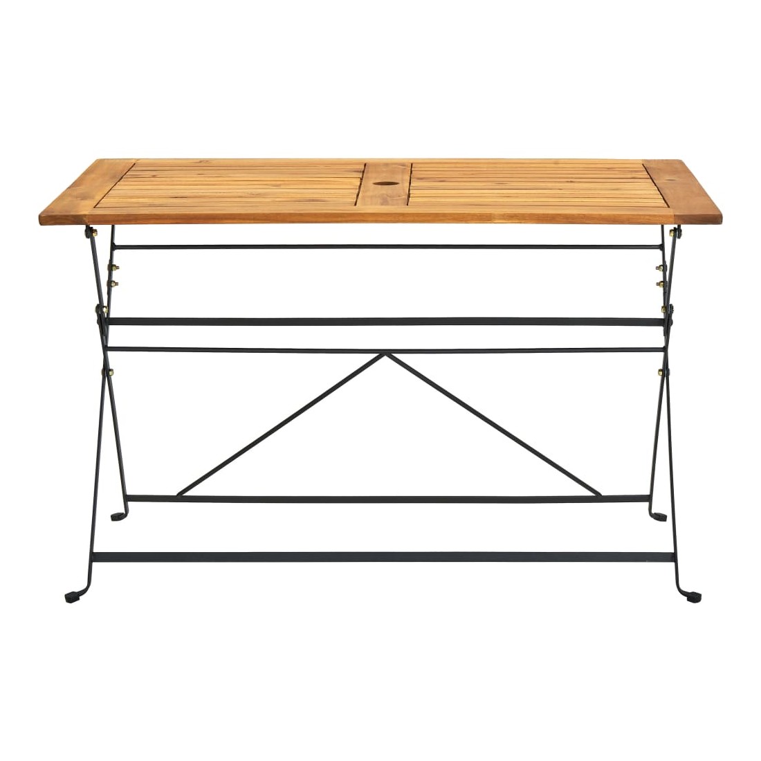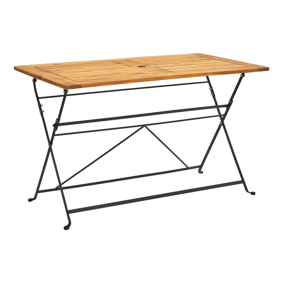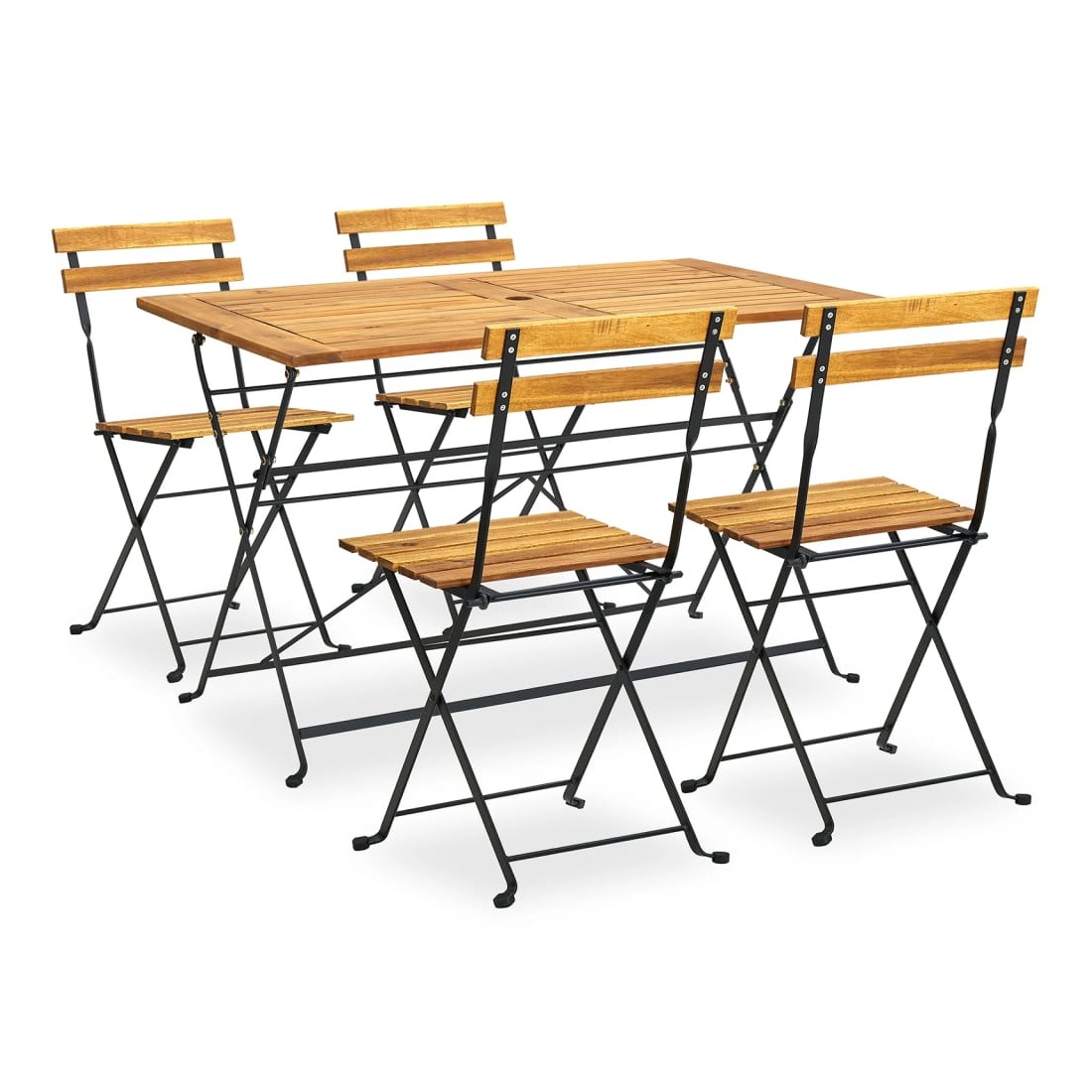 Cet élégant ensemble de salle à manger en bois en plein air ajoute de l’espace et une touche de charme rustique à votre jardin, terrasse ou patio ! Cet ensemble de salle à manger de jardin est fabriqué en bois d’acacia massif, un bois dur tropical, qui est résistant aux intempéries et très durable. L’acier robuste offre également une stabilité supplémentaire. La table et les chaises sont faciles à nettoyer avec un chiffon humide et peuvent être pliées pour économiser de l’espace lorsqu'elles ne sont pas utilisées. De plus, un trou de 5 cm de diamètre au centre de la table est prêt pour un parasol. Remarque : afin de prolonger la durée de vie des meubles d'extérieur, nous vous recommandons de les protéger avec une housse imperméable.