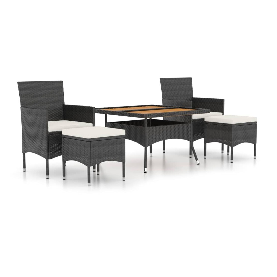 Cet ensemble élégant de salle à manger de jardin vous permet de passer des moments agréables et confortables avec votre famille et vos amis. Avec un cadre en acier enduit de poudre recouvert de résine tressée résistante aux intempéries avec protection UV, la table et les chaises sont durables et stables. Conçues avec un dossier et des accoudoirs incurvés, les chaises vous offrent du confort. Les coussins sont inclus pour plus de confort et la housse à fermeture éclair est amovible pour un lavage facile. Le dessus de table est fabriqué en bois d'acacia massif avec un support résistant, facile à nettoyer et à entretenir. Les deux repose-pieds vous offrent également des places d'assise supplémentaires. De plus, la construction légère rend chaque pièce facile à déplacer, à réorganiser et à