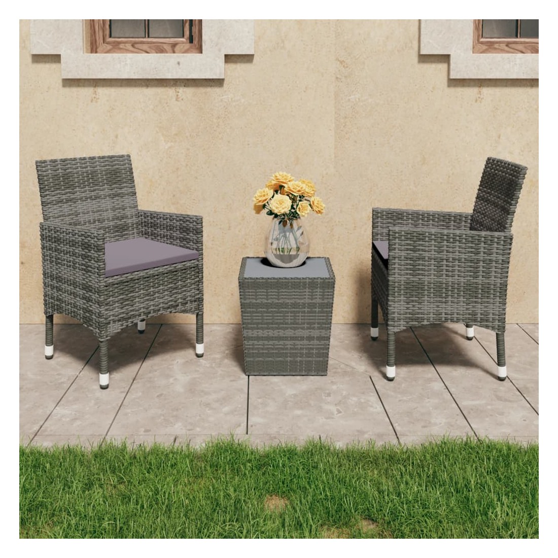Égayez votre cour arrière avec notre ensemble de bistro de 3 pièces et rendez l'extérieur de votre maison tout aussi accueillant que l'intérieur ! Il est idéal pour le petit balcon, la terrasse, la cour arrière, la véranda et tout autre espace extérieur ! Dotées d'un cadre en acier enduit de poudre recouvert de résine tressée résistante aux intempéries avec protection UV, la table et les chaises garantissent des années d'utilisation en plein air. Les chaises sont conçues dans une forme plus ergonomique pour un confort maximum. Des coussins sont inclus pour plus de soutien. Le dessus de table est en verre trempé renforcé avec support fort, facile à nettoyer et à entretenir.