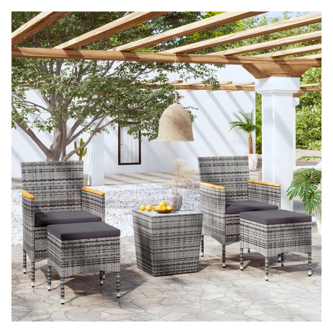 Cet ensemble élégant de bistro de jardin vous permet de passer des moments agréables et confortables avec votre famille et vos amis. Avec un cadre en acier enduit de poudre recouvert de résine tressée résistante aux intempéries avec protection UV, la table et les chaises sont durables et stables. Conçues avec un dossier et des accoudoirs incurvés, les chaises vous offrent du confort. Les coussins sont inclus pour plus de confort et la housse à fermeture éclair est amovible pour un lavage facile. Le dessus de table est en verre trempé renforcé avec un support résistant, facile à nettoyer et à entretenir. Les deux repose-pieds vous offrent également des places d'assise supplémentaires. De plus, la construction légère rend chaque pièce facile à déplacer, à réorganiser et à transporter. Remarque : afin de prolonger la durée de vie des meubles d'extérieur, nous vous recommandons de les protéger avec une housse imperméable.