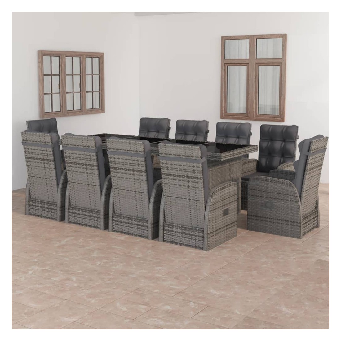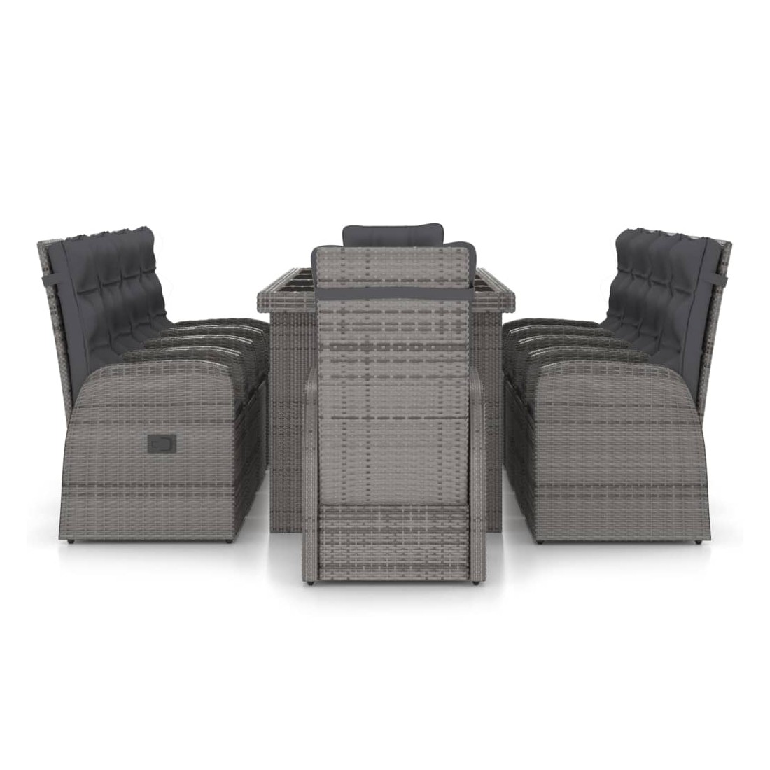 Cet ensemble de salle à manger d'extérieur, au design élégant et contemporain, est un supplément accrocheur à votre espace de vie extérieur. Cet ensemble de meubles de jardin est doté d'un cadre robuste en acier enduit de poudre, très stable et durable. La résine tressée rend cet ensemble de salle à manger facile à nettoyer, résistant à l'usure et adapté à une utilisation à l'extérieur. Le dessus de table en verre est facile à nettoyer avec un chiffon humide. Les chaises inclinables offrent le plus grand confort d'assise et un excellent soutien. Le dossier est facilement réglable selon votre désir en utilisant le bouton au côté. Les chaises avec repose-pied apportent également un confort supplémentaire. De plus, les coussins d'assise et de dossier épais et moelleux sont également très
