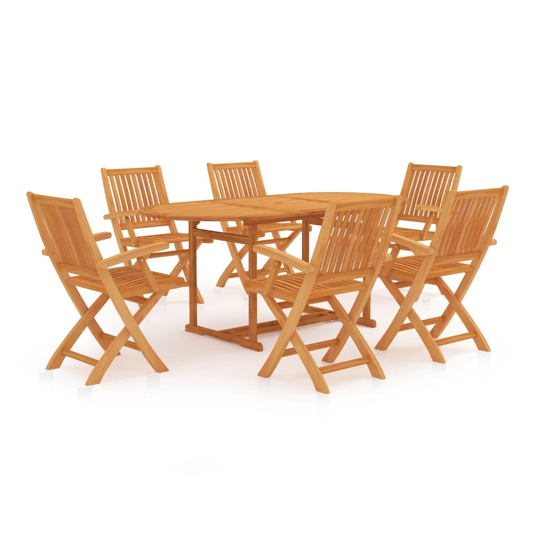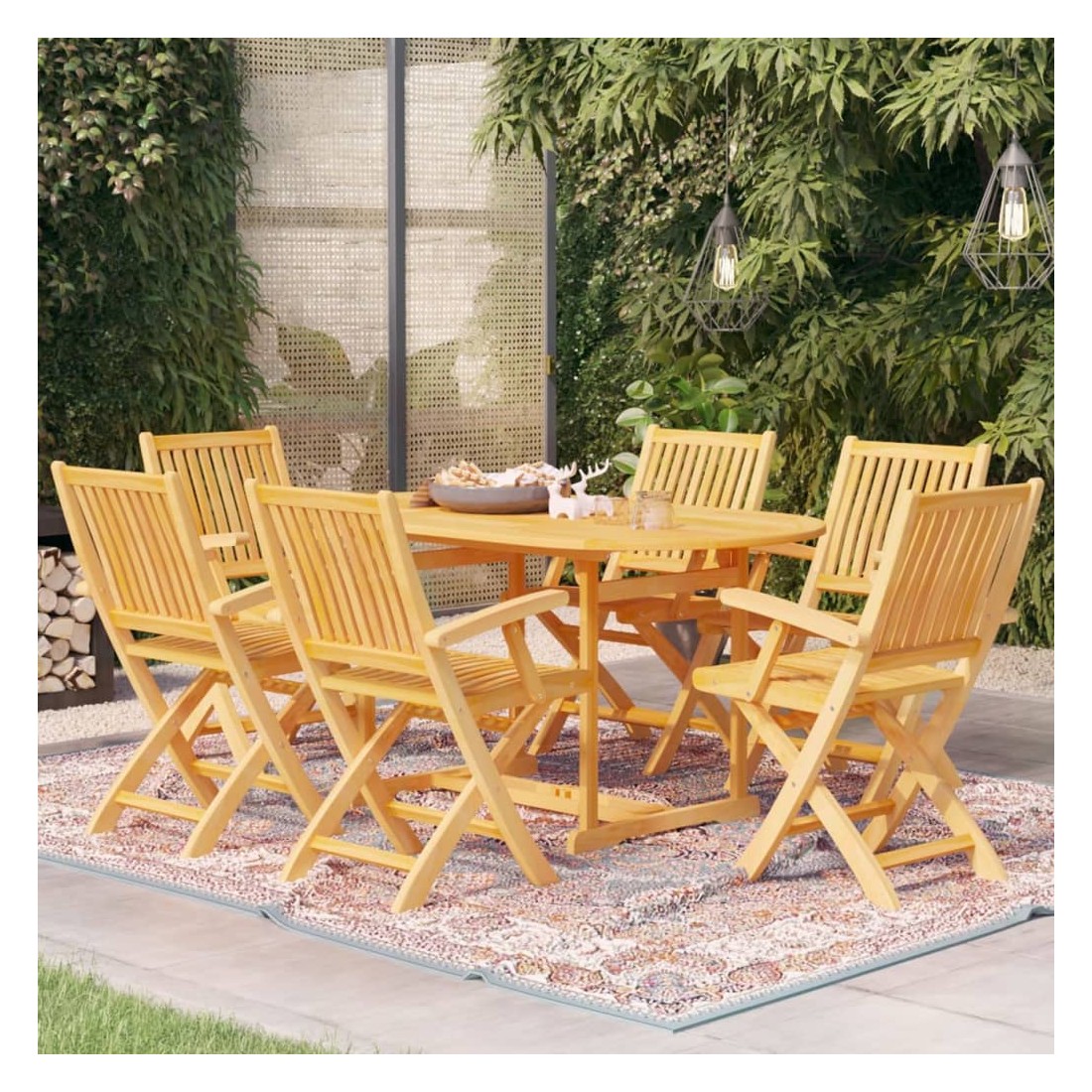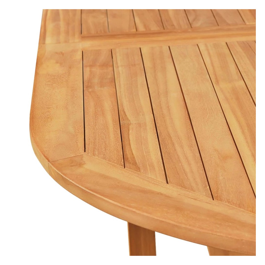 Cet ensemble de jardin en bois est parfait pour vos repas ou pour vous détendre dans le jardin ou sur le patio. Il est également idéal pour une utilisation à l'intérieur. Fabriquée en bois dur de teck extrêmement durable, cette pièce de meuble en teck a été chevronnée, séchée au four puis finement poncée pour lui donner un aspect très lisse. Le bois de teck est connu pour sa résistance exceptionnelle aux intempéries, ce qui le rend bien plus adapté aux meubles de jardin que tout autre type de bois. Le bois de teck est le choix idéal si vous souhaitez acheter une pièce de meubles de jardin durable. L’ensemble est appliqué avec une belle finition pour donner au bois une couleur chaude. La table comprend un trou pour un parasol afin de vous protéger du soleil. Les sièges et les dossiers incurvés des chaises peuvent bien s’adapter à votre corps. Avec un design pliable, les chaises peuvent être pliées pour économiser de l’espace lorsqu'elles ne sont pas utilisées. Elles sont également légères et faciles à déplacer. L’ensemble de meubles vous offre un confort et une grande commodité pour passer du temps avec votre famille et vos amis. De plus, cet ensemble est également facile à nettoyer avec un chiffon humide.