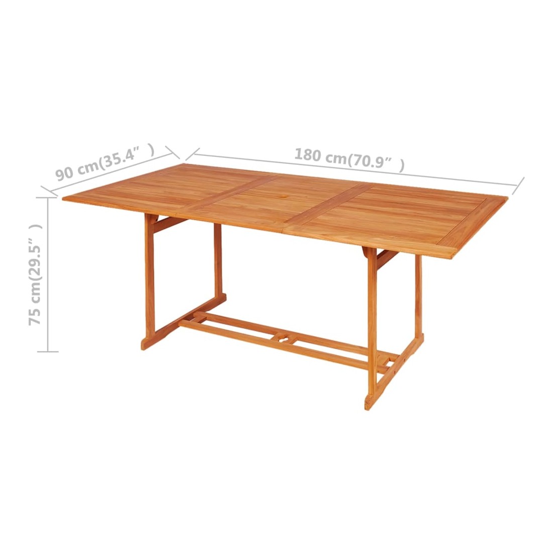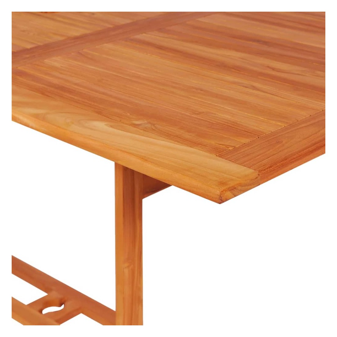 Cet ensemble de jardin en bois est parfait pour vos repas ou pour vous détendre dans le jardin ou sur le patio. Il est également idéal pour une utilisation à l'intérieur. Fabriquée en bois dur de teck extrêmement durable, cette pièce de meuble en teck a été chevronnée, séchée au four puis finement poncée pour lui donner un aspect très lisse. Le bois de teck est connu pour sa résistance exceptionnelle aux intempéries, ce qui le rend bien plus adapté aux meubles de jardin que tout autre type de bois. Le bois de teck est le choix idéal si vous souhaitez acheter une pièce de meubles de jardin durable. L’ensemble est appliqué avec une belle finition pour donner au bois une couleur chaude. La table comprend un trou pour un parasol afin de vous protéger du soleil. Les dossiers des chaises sont réglables en 5 positions, de sorte que vous puissiez toujours trouver les positions les plus confortables. Avec un design pliable, les chaises peuvent être pliées pour économiser de l’espace lorsqu'elles ne sont pas utilisées. Elles sont également légères et faciles à déplacer. Les coussins bien rembourrés offrent le plus grand confort et les housses de coussin sont amovibles pour un lavage facile. L’ensemble de meubles vous offre un confort et une grande commodité pour passer du temps avec votre famille et vos amis. De plus, cet ensemble est également facile à nettoyer avec un chiffon humide.