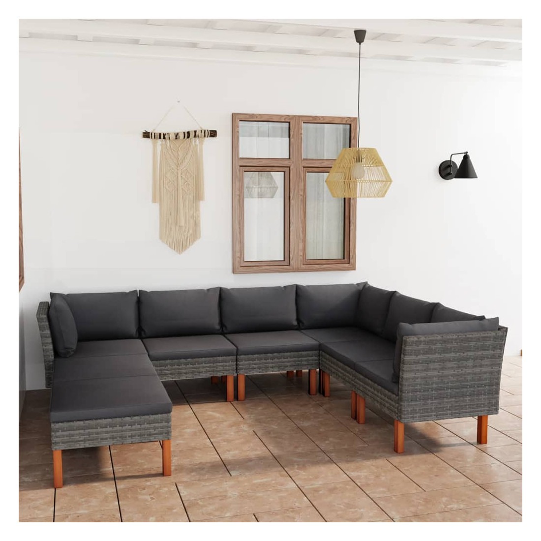 Cet ensemble de salon de jardin élégant et confortable, est un choix idéal pour vous détendre et profiter du beau temps, faire une sieste ou discuter avec votre famille ou vos amis. Doté d’un cadre en acier enduit de poudre recouvert de résine tressée, l'ensemble de canapé est résistant aux intempéries et facile à nettoyer. Les pieds en bois d’eucalyptus massif contribuent à sa robustesse et à sa stabilité. L'ensemble de salon est livré avec des coussins rembourrés pour un confort suprême. Dotée d'une fermeture éclair, la housse des coussins est amovible et lavable. De plus, cet ensemble de canapés d'extérieur peut être facilement déplacé pour s’adapter à n’importe quelle configuration grâce à sa construction légère. Remarque : afin de prolonger la durée de vie des meubles d'extérieur, nous vous recommandons de les protéger avec une housse imperméable.