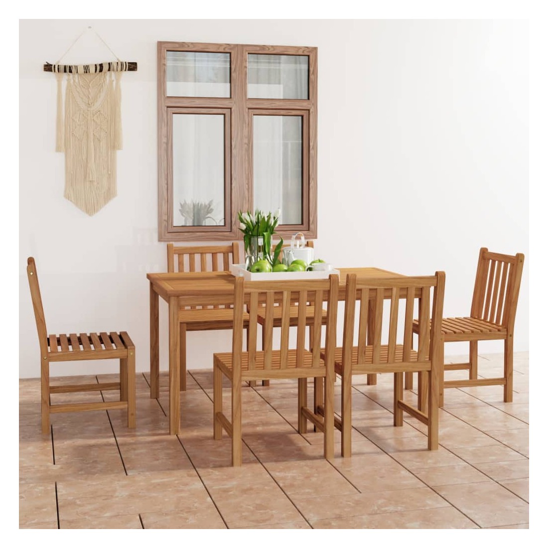 Cet ensemble de salle à manger de jardin en bois ajoute une touche de charme naturel à votre cuisine, jardin ou terrasse. Fabriquée en bois dur de teck extrêmement durable, cette pièce de meuble en teck a été chevronnée, séchée au four puis finement poncée pour lui donner un aspect très lisse. Le bois de teck est connu pour sa résistance exceptionnelle aux intempéries, ce qui le rend bien plus adapté aux meubles de jardin que tout autre type de bois. Le bois de teck est le choix idéal si vous souhaitez acheter une pièce de meubles de jardin durable. Une belle finition à base d'eau est appliquée pour donner au bois une couleur chaude. Grâce au dessus de table extra épais et aux grands pieds, cette table en bois solide est très durable et peut accueillir confortablement vos invités. Les chaises ont un look raffiné qui peut s'intégrer instantanément dans n'importe quel espace de vie. Avec sa fonction de résistance à l'eau et son aspect classique, vous pouvez placer cet ensemble de meubles partout autour de votre maison - à l'intérieur ou à l'extérieur !