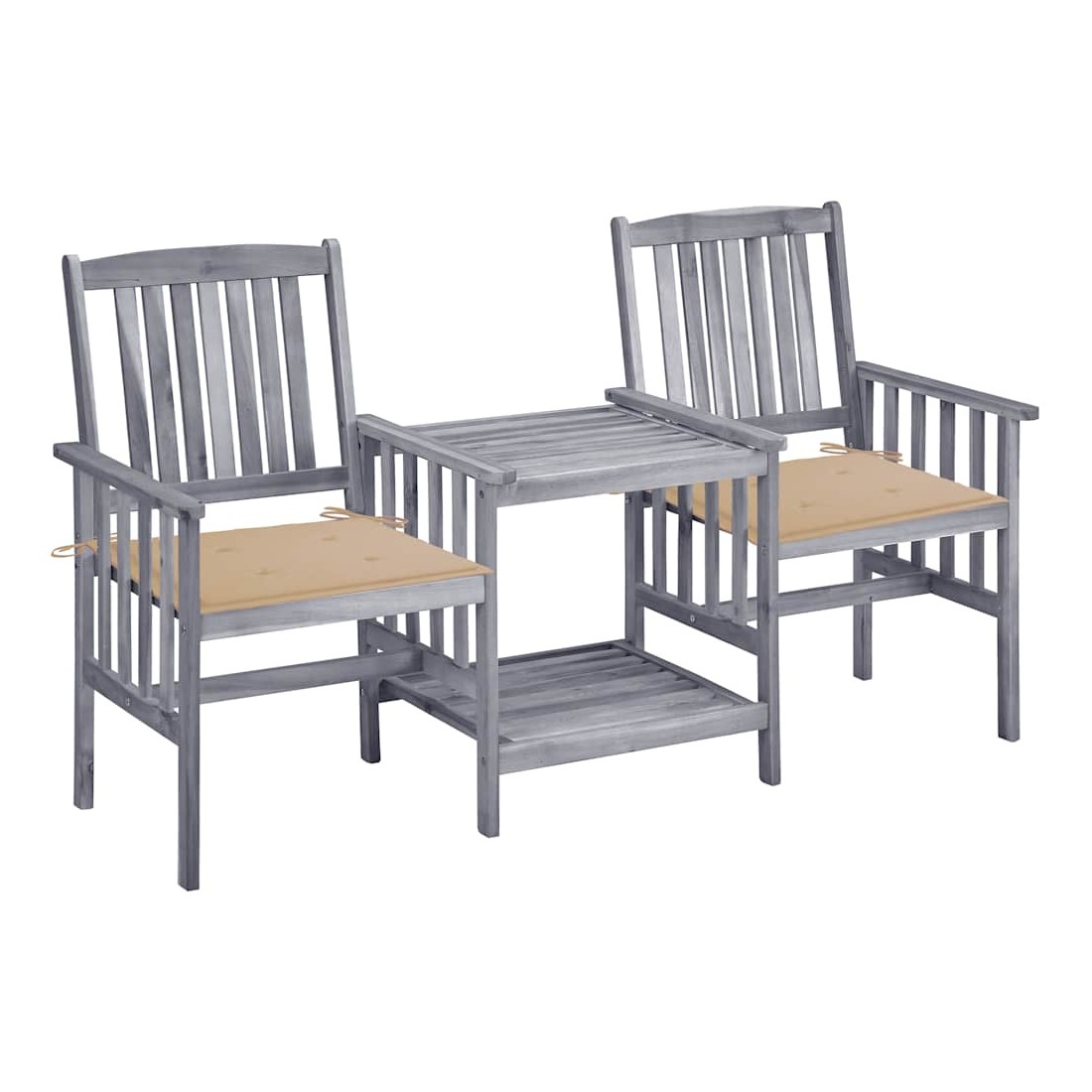 Laissez-vous emporter par une merveilleuse heure du thé avec ces chaises de jardin rustiques en bois avec table à thé. Elle apportera une touche vraiment conviviale et accrocheuse à votre jardin et terrasse. La table et les chaises sont en bois d'acacia massif, ce qui leur permet d'être extrêmement stables et robustes. Le dessus de table robuste et l'étagère inférieure sont idéaux pour ranger vos tasses, livres et autres petits objets. Et les dossiers et les accoudoirs des chaises garantissent une expérience d'assise reposante. De plus, les coussins ajoutent un confort supplémentaire. Chaque coussin comprend deux jeux de cordes pour le fixer fermement sur l'ensemble de bistro. Remarque : afin de prolonger la durée de vie des meubles d'extérieur, nous vous recommandons de les protéger avec une housse imperméable.