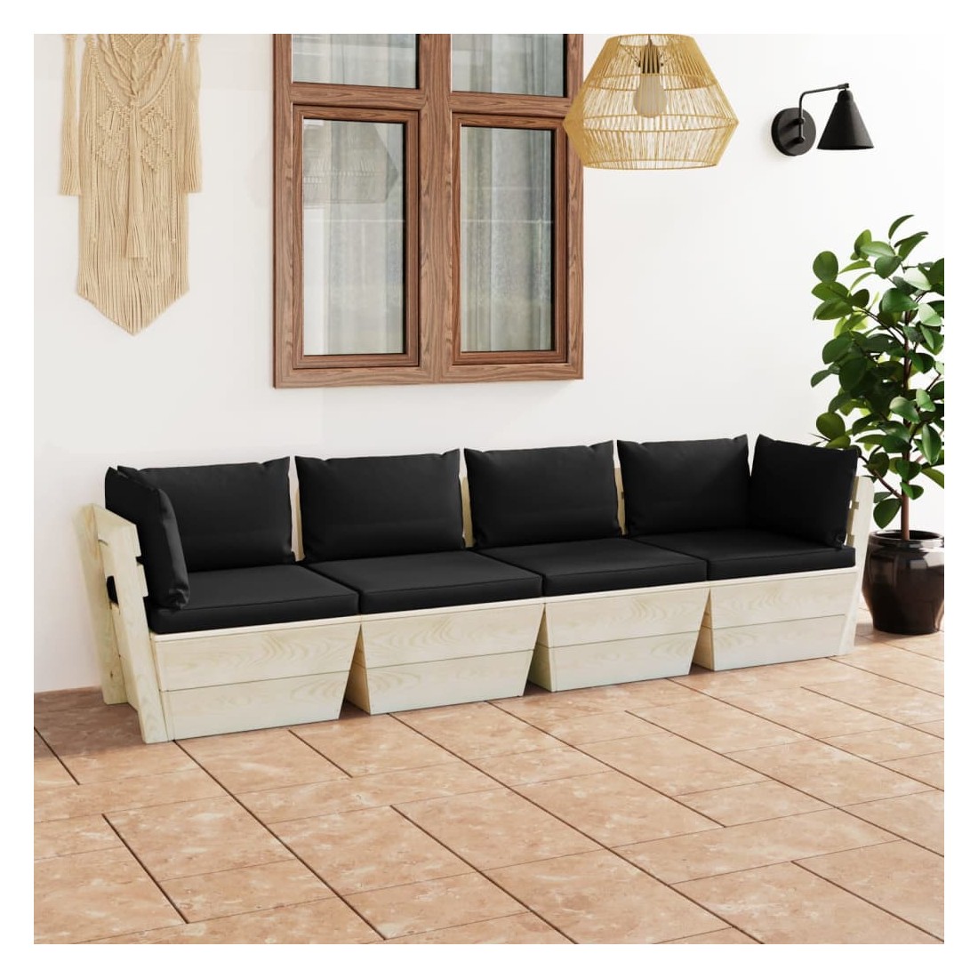 vidaXLCe canapé palette à 4 places de jardin à la mode avec coussins est un excellent choix pour vous détendre, profiter du beau temps, faire une sieste ou discuter en famille ou entre amis. Avec son design intemporel de palette, ce canapé en bois ajoute une touche de charme rustique à votre terrasse, jardin ou salon. Le siège de canapé d'extérieur est en bois d'épicéa imprégné, ce qui le rend durable et stable. Ce canapé a une construction solide et nécessite peu d'entretien. Grâce à la tapisserie 100 % polyester et au rembourrage épais, les coussins de palette sont doux et offrent le plus grand confort. De plus, la conception modulaire permet également de placer l’ensemble dans n’importe quel arrangement selon votre goût. Veuillez noter que le bois est un produit naturel et peut présenter des imperfections.