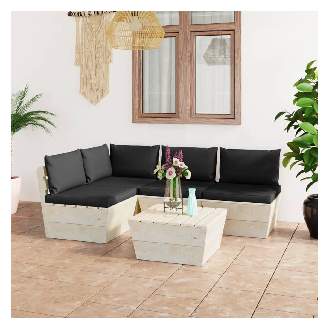 vidaXLCet ensemble de salon de jardin palette de 5 pièces à la mode avec coussins est un excellent choix pour vous détendre et profiter du bon temps, faire une sieste ou discuter avec votre famille ou vos amis. L’ensemble de salon en bois, avec un design de palette intemporel, ajoute une touche de charme rustique à votre patio, jardin ou salon. L’ensemble de salon de jardin est en bois d'épicéa imprégné, ce qui le rend durable et stable. Cet ensemble de canapés de patio présente une construction solide et nécessite peu d’entretien. Avec un dessus de table solide, la table est idéale pour garder la nourriture et les boissons à portée de main. Grâce à la tapisserie 100 % polyester et au rembourrage épais, les coussins de palette sont doux et offrent le plus grand confort. De plus, la conception modulaire permet également de placer l’ensemble dans n’importe quel arrangement selon votre goût. Veuillez noter que le bois est un produit naturel et peut présenter des imperfections.
