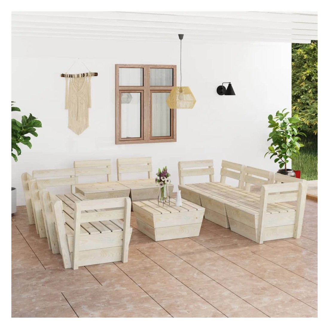 Cet ensemble de salon de jardin palette de 9 pièces est un excellent choix pour vous détendre et profiter du beau temps, faire une sieste ou discuter avec votre famille ou vos amis. L’ensemble de salon en bois, avec un design de palette intemporel, ajoute une touche de charme rustique à votre patio, jardin ou salon. L'ensemble de salon de jardin est fait de bois d'épicéa imprégné, ce qui le rend durable et stable. Cet ensemble de canapé de patio est de construction solide et nécessite peu d'entretien. De plus, la conception modulaire permet également de placer l'ensemble dans n'importe quel arrangement selon votre goût. Veuillez noter que le bois est un produit naturel et peut présenter des imperfections.