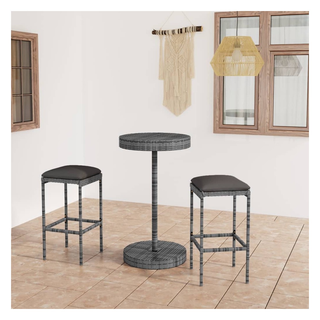 Cet ensemble élégant de bar de jardin vous permet de passer des moments agréables et confortables avec votre famille et vos amis. La table de bar est soutenue par un cadre en acier enduit de poudre, ce qui la rend stable et robuste. Le dessus de table rond est idéal pour placer des boissons, de la nourriture ou des objets décoratifs. Les tabourets ont une construction solide de cadre en acier et sont faits de résine tressée résistante aux intempéries, assurant la stabilité et sont faciles à déplacer. Le coussin et le repose-pied ajoutent également du confort d’assise supplémentaire au tabouret. La housse de coussin en polyester avec fermeture éclair dissimulée le rend facile à nettoyer.