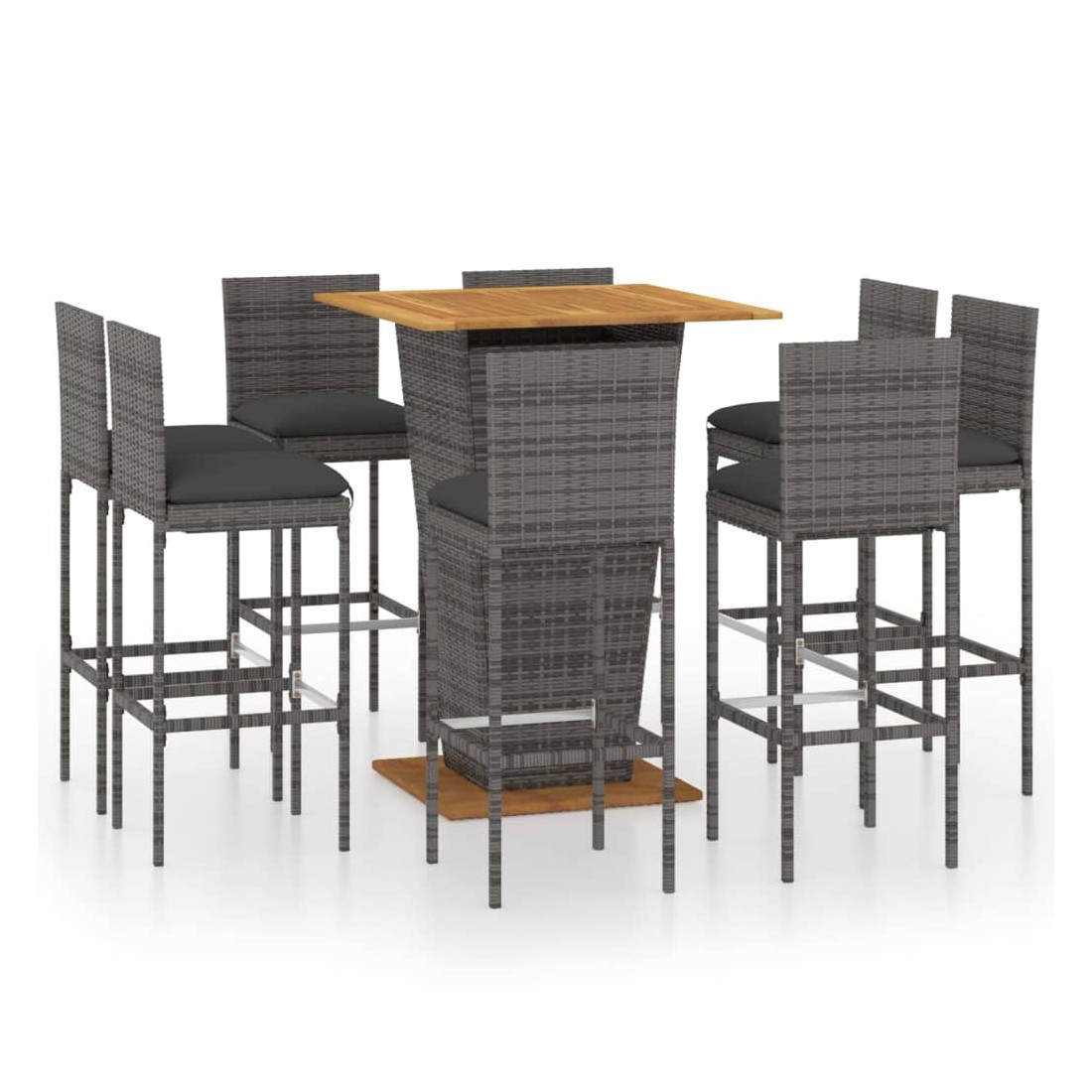 Cet ensemble élégant de bar de jardin vous permet de passer des moments agréables et confortables avec votre famille et vos amis. Dotée d’un cadre en acier enduit de poudre recouvert de résine tressée, cette table de comptoir garantit des années d’utilisation en extérieur. De plus, le dessus de table et la base en bois d’acacia massif ajoutent une robustesse et une stabilité supplémentaires. Les tabourets ont une construction solide de cadre en acier et sont fabriqués en résine tressée résistante aux intempéries, ce qui garantit leur stabilité et leur facilité de déplacement. Le coussin et le repose-pied ajoutent également un confort d'assise supplémentaire à la chaise. Remarque : afin de prolonger la durée de vie des meubles d'extérieur, nous vous recommandons de les protéger avec une housse imperméable.