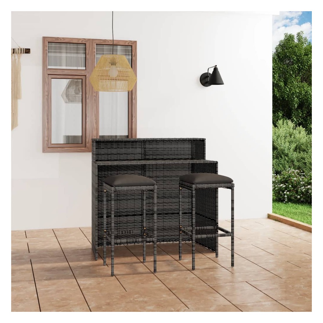 Cet ensemble de bar de jardin a un design élégant et sera le point de mire de votre jardin, patio ou terrasse. Fabriqué en résine tressée résistante aux intempéries et imperméable, cet ensemble de bar est facile à nettoyer, résistant à l'usure et adapté à une utilisation quotidienne. Le cadre en acier enduit de poudre rend la table et les tabourets très robustes et durables. Grace à la construction légère, tous les articles sont faciles à déplacer. Les coussins de siège amovibles et épais sont très confortables. Les housses des coussins avec fermetures éclair peuvent être facilement enlevées et lavées. Remarque : afin de prolonger la durée de vie des meubles d'extérieur, nous vous recommandons de les protéger avec une housse imperméable.