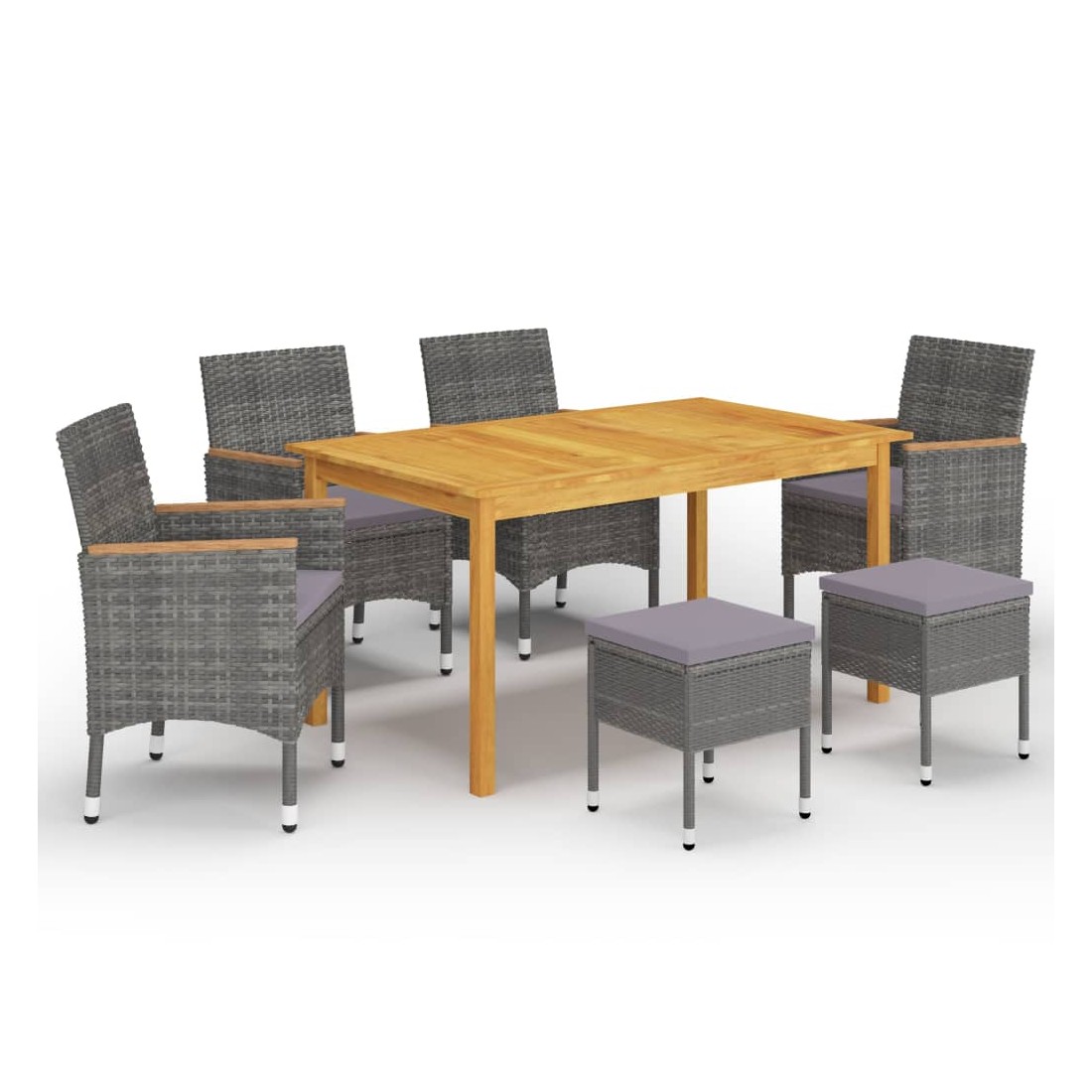 Créez une esthétique convaincante et uniforme dans votre espace extérieur avec cet ensemble de salle à manger de jardin ! La table de salle à manger est en bois d’acacia massif avec une finition à l’huile, ce qui la rend stable, durable et facile à entretenir. Dotés d’un cadre en acier enduit de poudre recouvert de résine tressée résistante aux intempéries, ces chaises et tabourets sont robustes et faciles à nettoyer. La chaise d'extérieur, conçue avec un dossier et des accoudoirs incurvés, présente une forme plus ergonomique pour un confort maximal. Les accoudoirs sont joliment décorés avec du bois d'acacia massif, ce qui apporte une touche de charme rustique. Chaque siège est doté d'un coussin rembourré amovible pour ajouter du confort pendant votre temps de détente. Remarque importante : Nous vous recommandons de couvrir l'ensemble de salle à manger pendant la pluie, la neige et le gel pour une utilisation durable.
