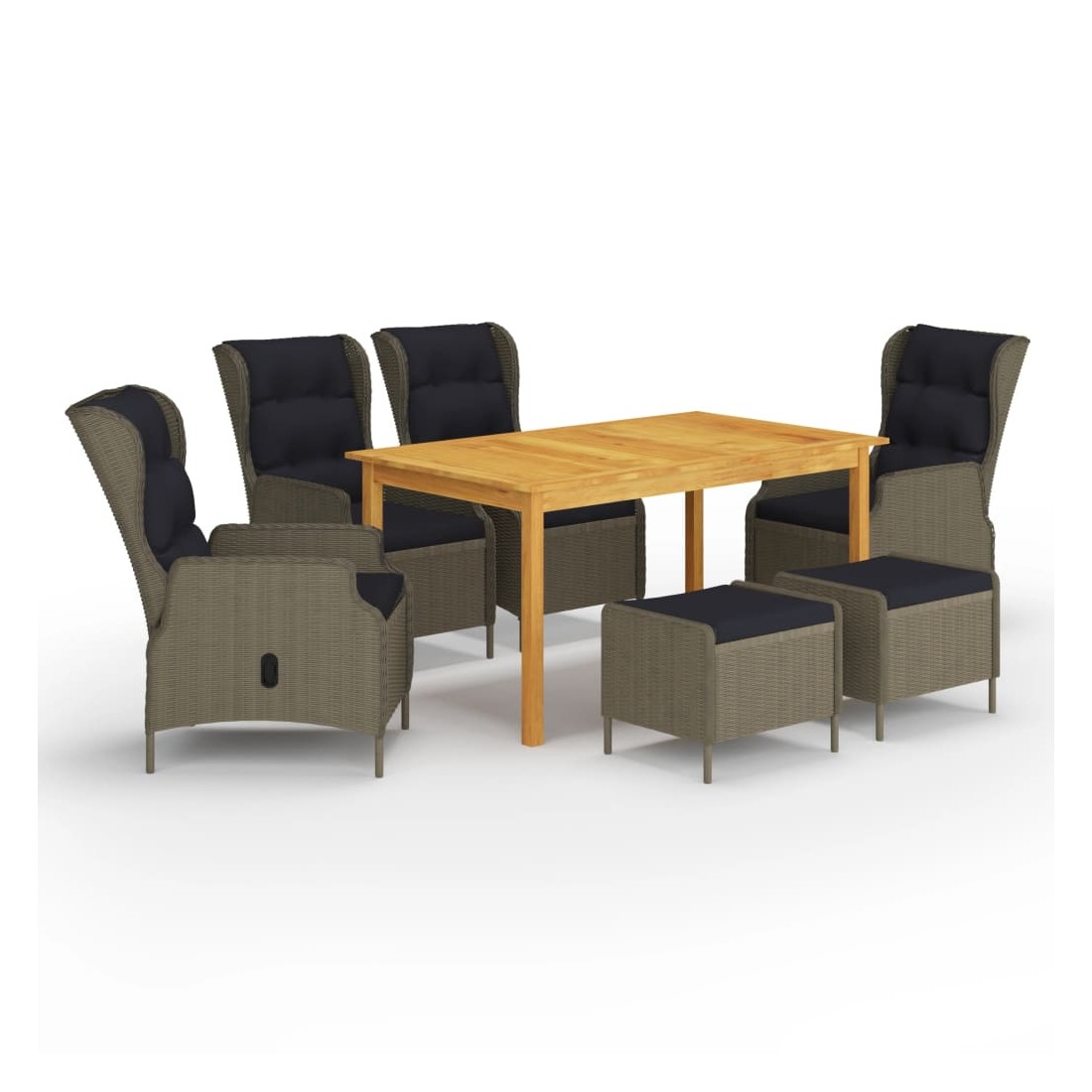 Créez une esthétique convaincante et uniforme dans votre espace extérieur avec cet ensemble de salle à manger de jardin ! La table de salle à manger est fabriquée en bois d’acacia massif avec une finition à l’huile, ce qui la rend stable, durable et facile à entretenir. La chaise et le tabouret d'extérieur, dotés d’un cadre en acier enduit de poudre recouvert de résine tressée ronde, sont robustes et faciles à nettoyer. Les coussins bien rembourrés ajoutent un confort supplémentaire lors de votre temps de détente. La housse de coussin est équipée d’une fermeture éclair, amovible et lavable. Grâce au mécanisme de levage à gaz, le dossier est également réglable pour s’adapter à vos positions. En appuyant sur le bouton sur le côté, le dossier peut s’incliner, pour une position couchée confortable. De plus, la chaise et le tabouret de jardin sont faciles à déplacer grâce à leur construction légère. Remarque importante : Nous vous recommandons de couvrir l'ensemble de salle à manger pendant la pluie, la neige et le gel pour une utilisation durable.