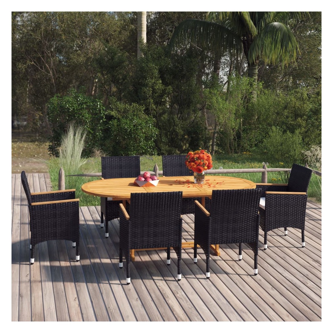 Créez une esthétique convaincante et uniforme dans votre espace extérieur avec cet ensemble de salle à manger de jardin ! La table à manger est fabriquée en bois d’acacia massif, ce qui la rend robuste et stable. La surface à finition à l'huile la rend également adaptée pour une utilisation en extérieur. Dotées d’un cadre en acier recouvert de résine tressée résistante aux intempéries, les chaises sont robustes et faciles à nettoyer. Les accoudoirs sont joliment décorés avec du bois d’acacia massif, qui apporte un sentiment de charme rustique. Les coussins bien rembourrés ajoutent également un confort d’assise supplémentaire à votre temps de détente. Remarque : afin de prolonger la durée de vie des meubles d'extérieur, nous vous recommandons de les protéger avec une housse imperméable.