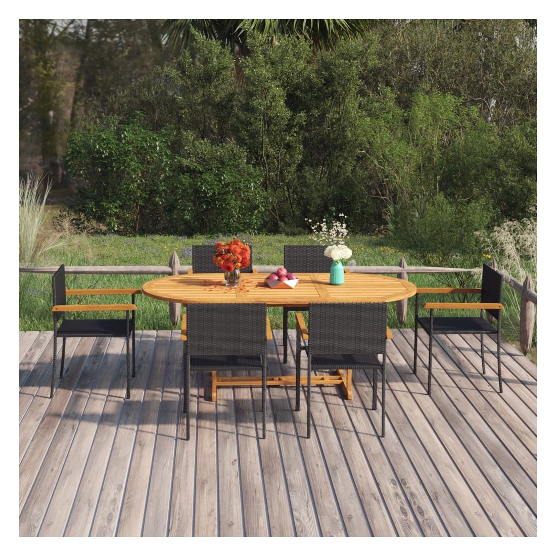 Créez une esthétique convaincante et uniforme dans votre espace extérieur avec cet ensemble de salle à manger de jardin ! La table à manger est en bois d'acacia massif, ce qui la rend robuste et stable. La surface à finition à l'huile la rend également appropriée pour une utilisation dehors. Dotées d'un cadre en acier recouvert de résine tressée résistante aux intempéries, les chaises de salle à manger sont robustes et faciles à nettoyer. Les accoudoirs sont joliment décorés de bois d'acacia massif, ce qui apporte une touche de charme rustique. Remarque : afin de prolonger la durée de vie des meubles d'extérieur, nous vous recommandons de les protéger avec une housse imperméable.