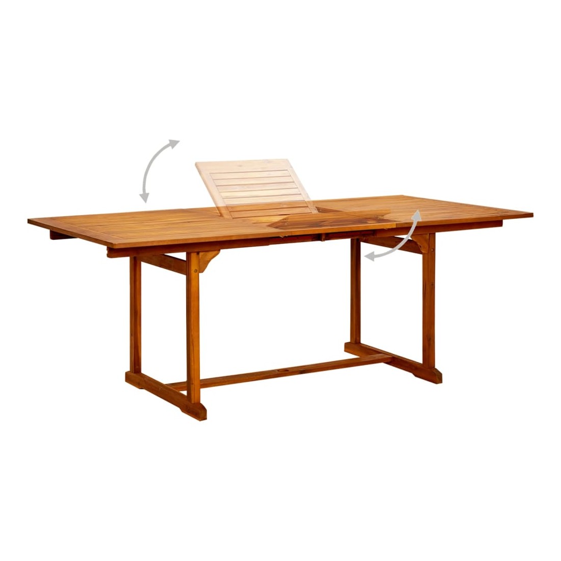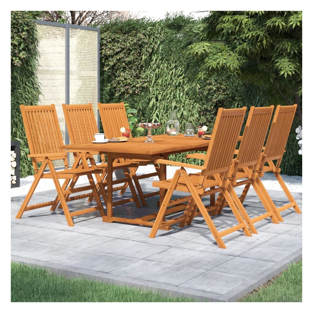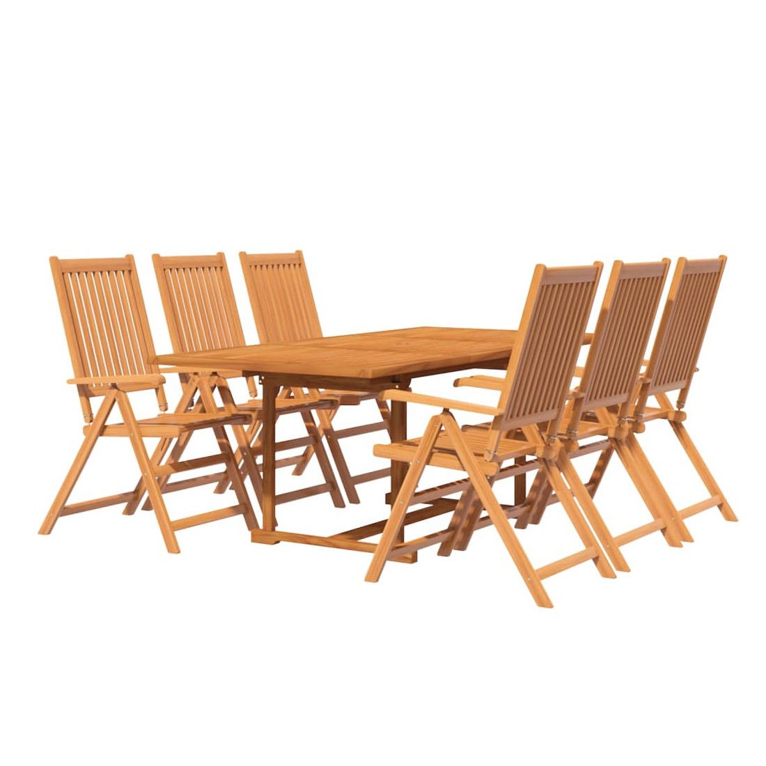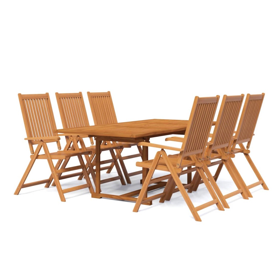 Profitez d'un bon repas en plein air avec votre famille et vos amis avec cet ensemble de salle à manger de jardin en bois ! Matériau de qualité supérieure : cet ensemble de salle à manger est fabriqué en bois d'acacia massif, un bois dur tropical, qui résiste aux intempéries et est durable pour des années d'utilisation. La surface à finition à l'huile est facile à nettoyer avec un chiffon humide.Table extensible : la table à manger est extensible, répondant à vos différents besoins.Chaise réglable et pliable : la chaise d'extérieur peut être réglée sur 5 positions, vous offrant un confort d'assise optimal. Ces chaises de salle à manger peuvent également être pliées pour économiser de l'espace lorsqu'elles ne sont pas utilisées. Remarque :Afin de prolonger la durée de vie de votre mobilier d'extérieur, nous vous recommandons de le protéger avec une housse imperméable.